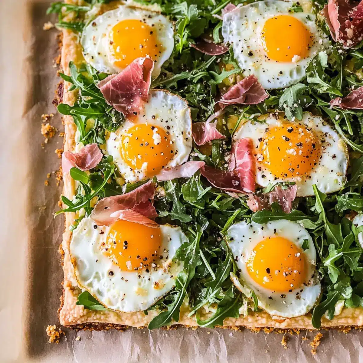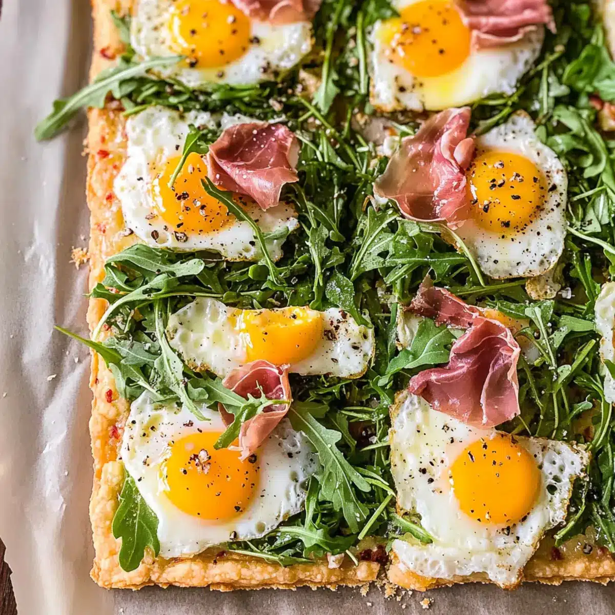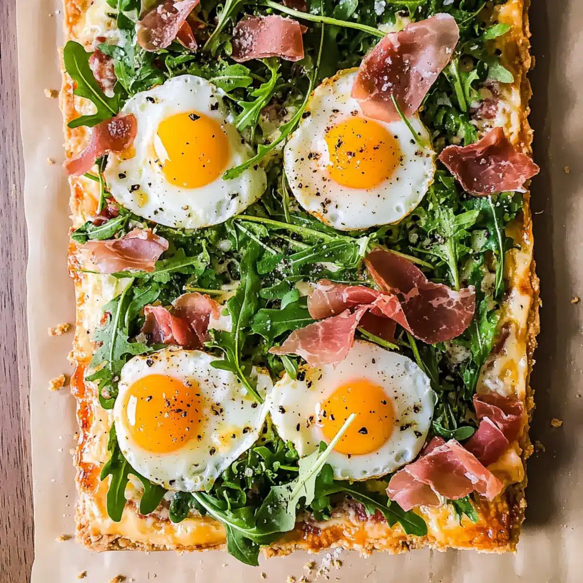 Textures to Savor: Flaky pastry complements the soft eggs and fresh arugula, offering a mouthwatering contrast that keeps each slice exciting.