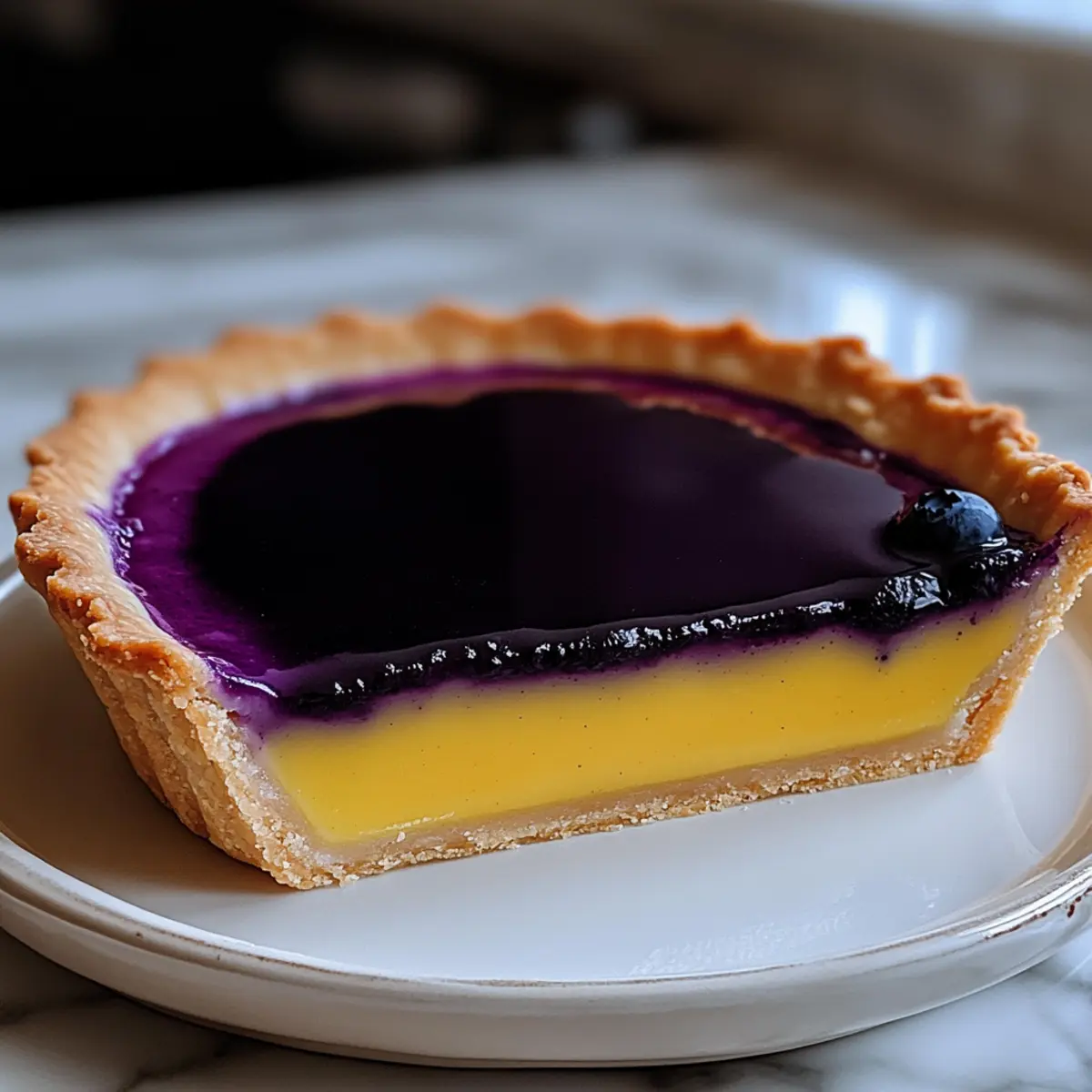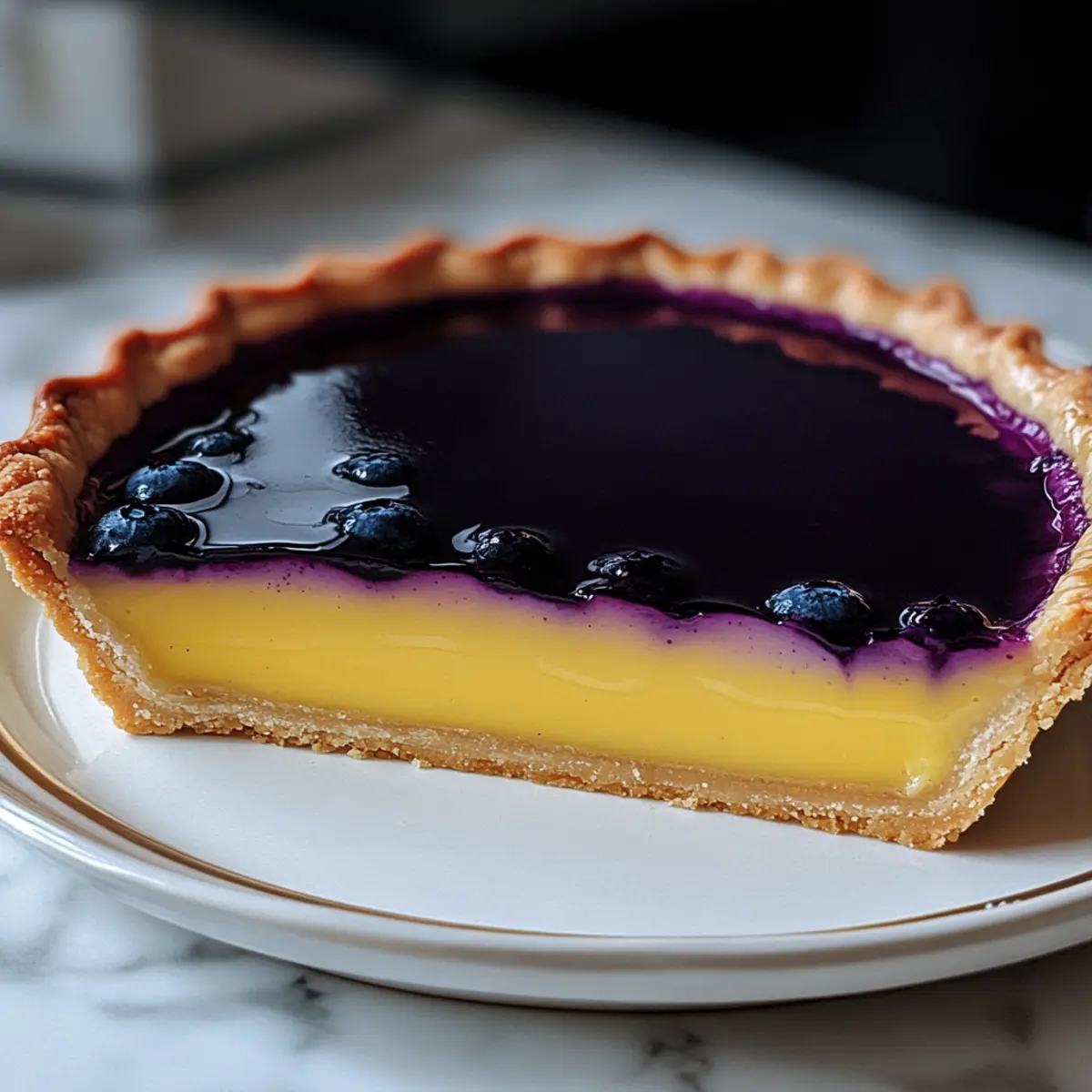 - Pour the lemon curd into the cooled tart crust and spread evenly. Preheat the oven to 350°F (175°C) and bake for 10-12 minutes until just set. Let the tart cool completely before adding the blueberry layer.