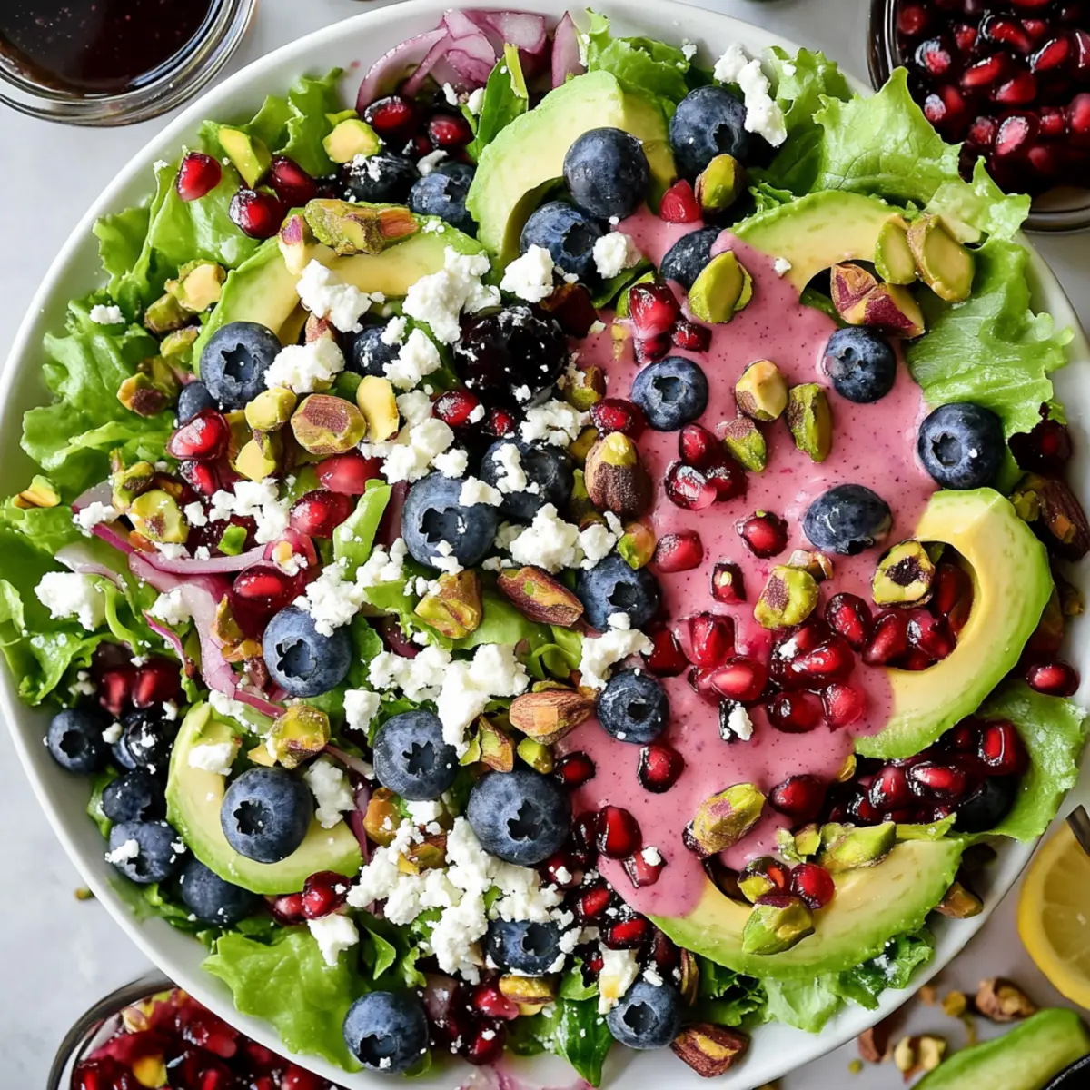 Just before serving, generously drizzle the creamy pomegranate dressing over the salad. This dressing will tie all the flavors together beautifully. Optionally, sprinkle with cracked black pepper for an extra kick. Serve your Blueberry Pistachio Spring Salad immediately to enjoy the freshness at its best, or keep the dressing separate if preparing in advance.