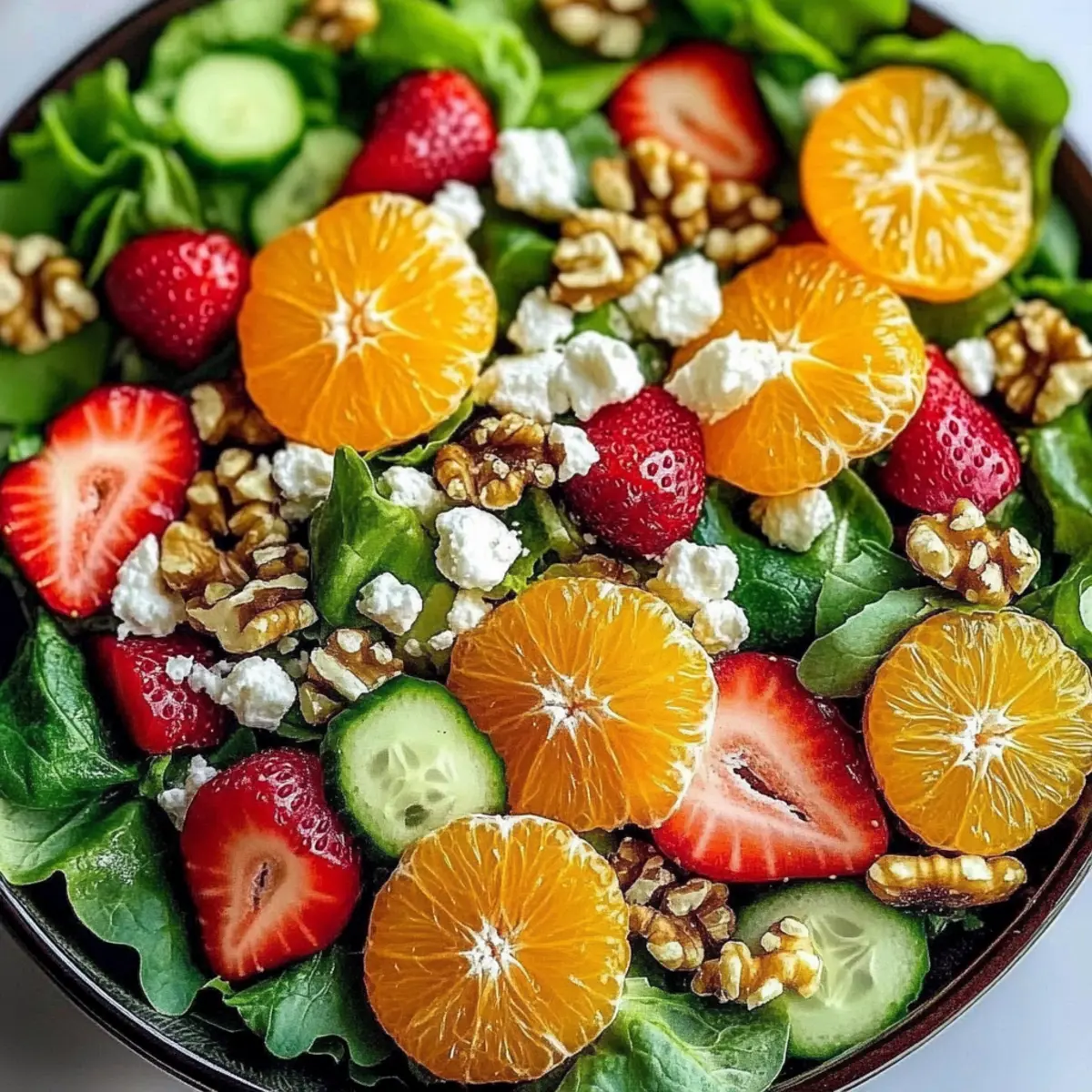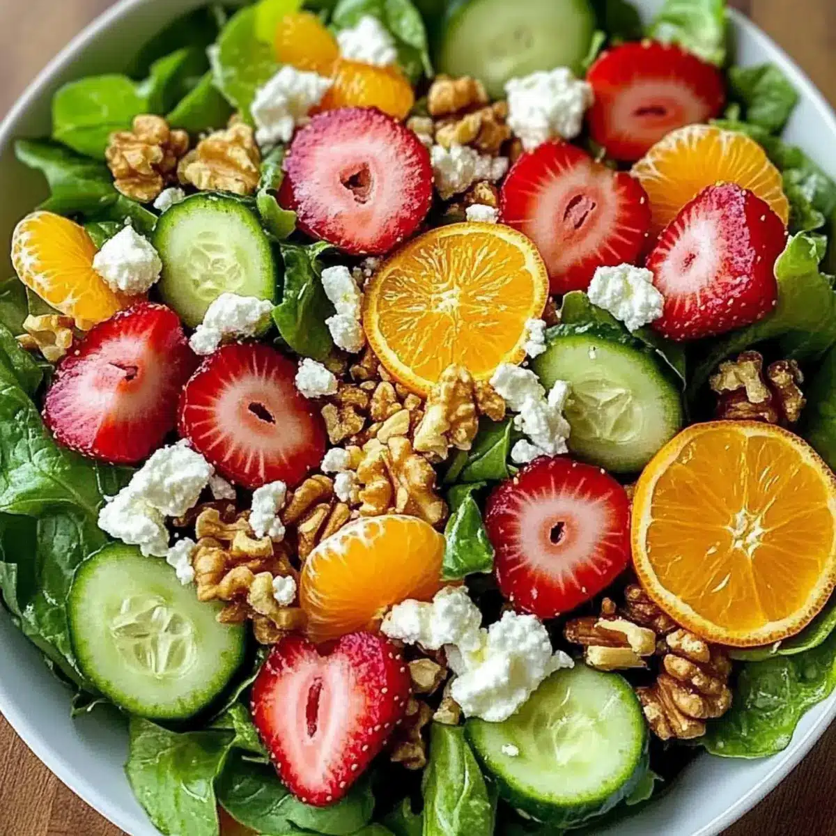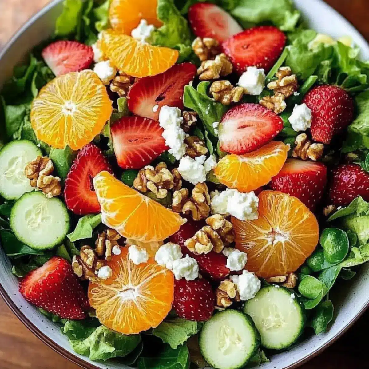 In a large bowl, add a generous mixture of fresh salad greens, such as spinach, arugula, and romaine. Rinse the greens in cold water, then spin them in a salad spinner to remove excess moisture. Next, slice strawberries and segment your oranges, adding them to the bowl along with sliced cucumber and thinly sliced red onion for a colorful and crunchy base.