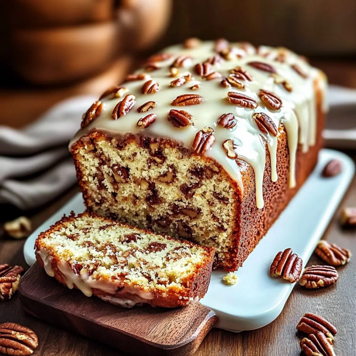 - Pour glaze over the cooled loaf and garnish with additional chopped pecans.