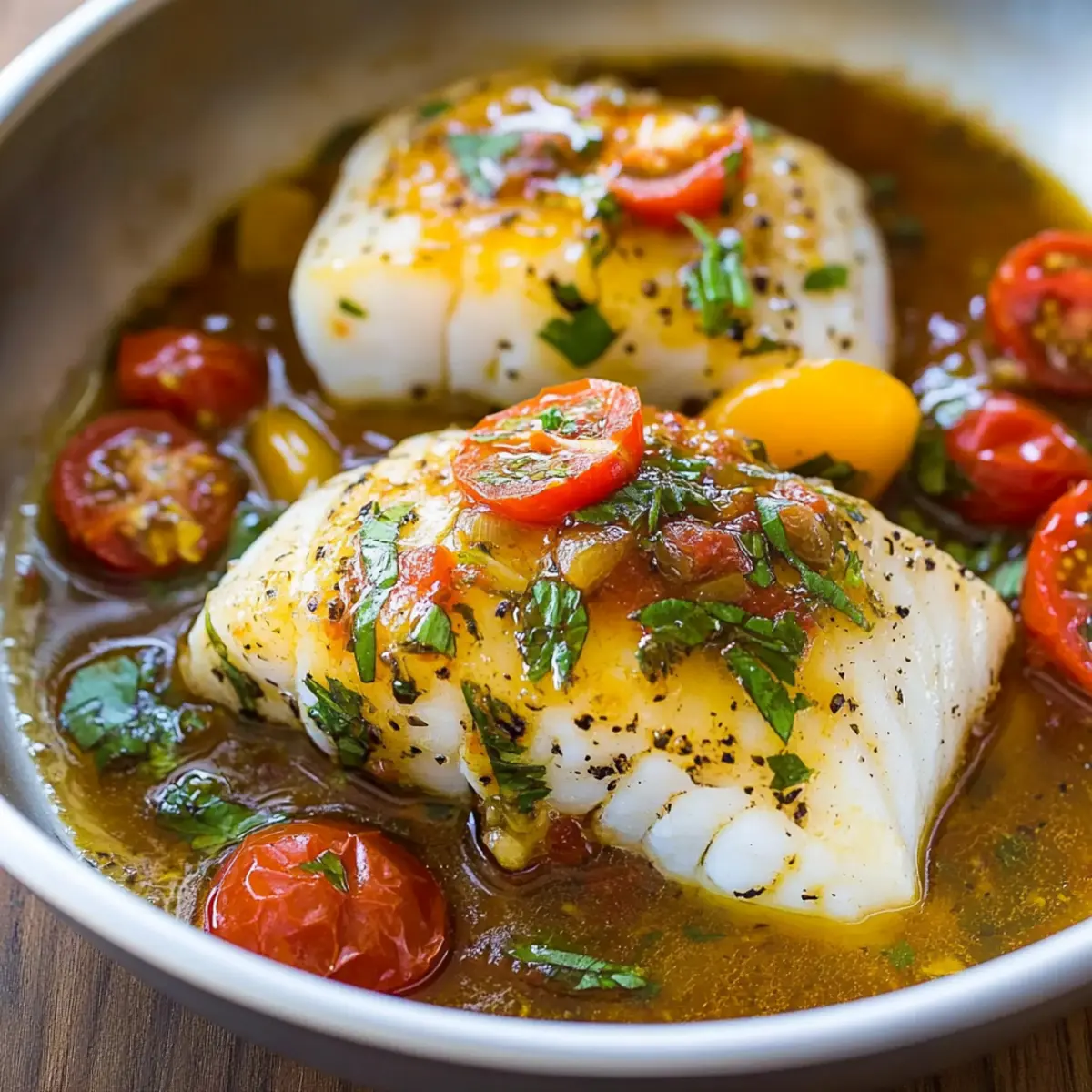 Pan-Seared Cod in a Rich White Wine Tomato Basil Sauce