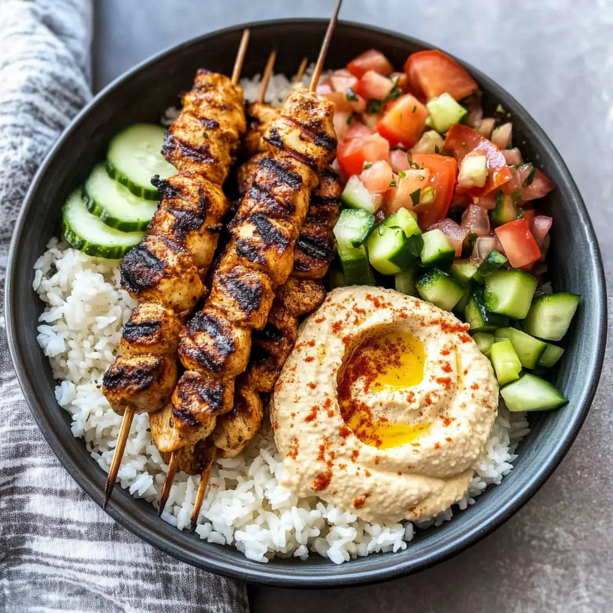 Mediterranean Rice Bowl with Grilled Chicken Tawook Skewers Bliss