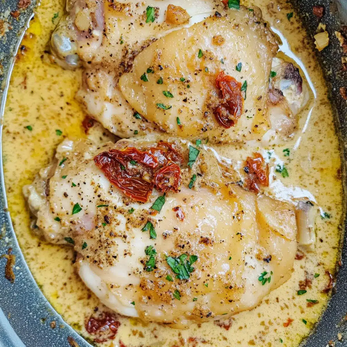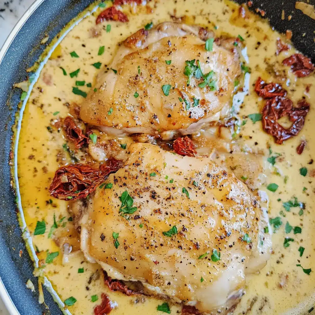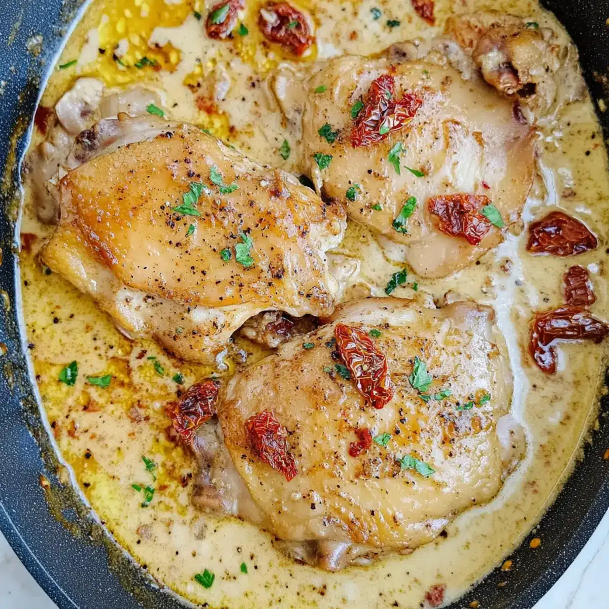Flavor-packed indulgence: The rich creamy sauce, infused with garlic and sun-dried tomatoes, transforms simple chicken thighs into a gourmet experience that will impress any dinner guest.