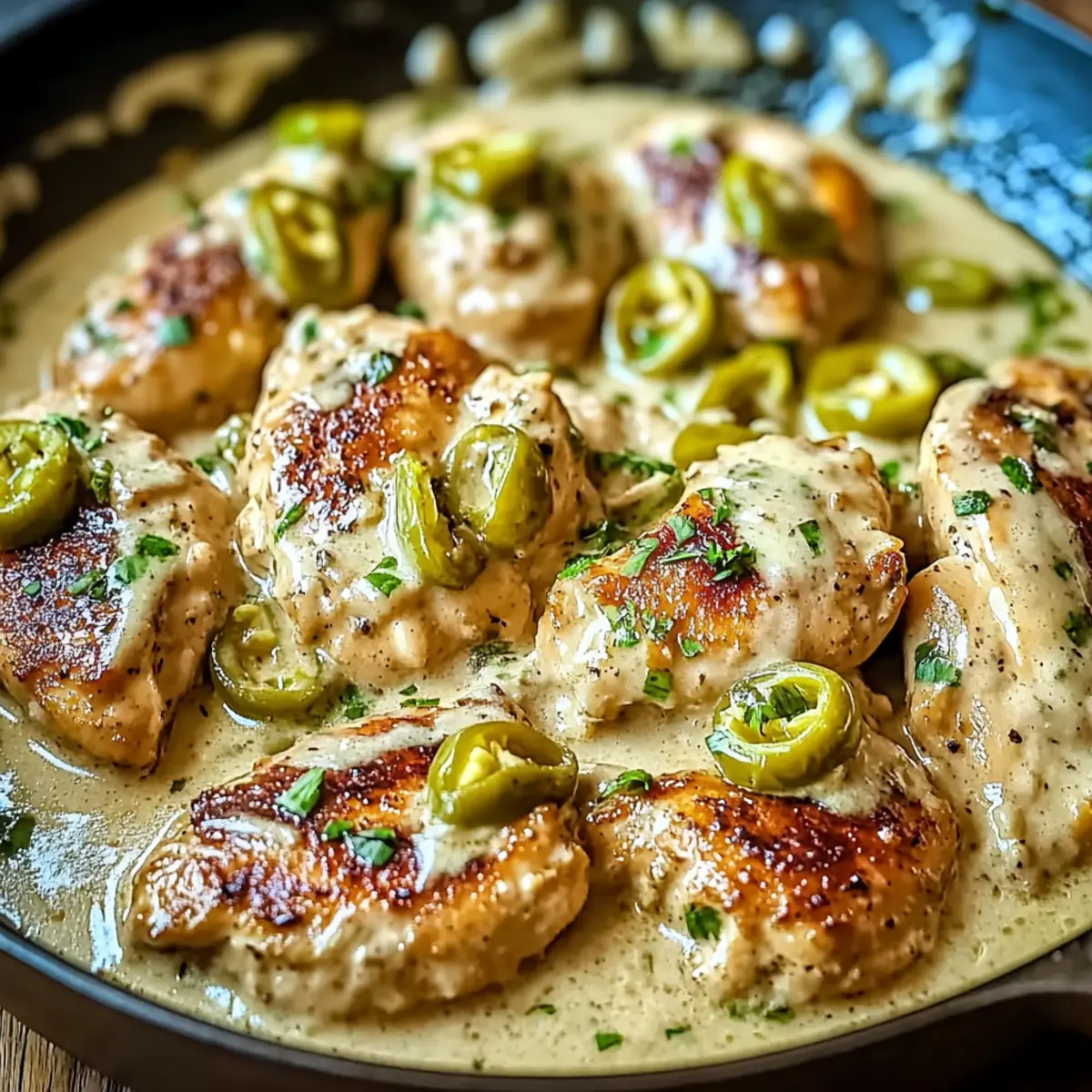 No worries! If you find that the sauce in your Creamy Pepperoncini Chicken Skillet is too thin, simply let it simmer a bit longer over medium heat. This will allow it to reduce and thicken further. If needed, you can mix a teaspoon of cornstarch with a tablespoon of cold water to create a slurry; add this to the sauce and cook for a few more minutes until thickened.