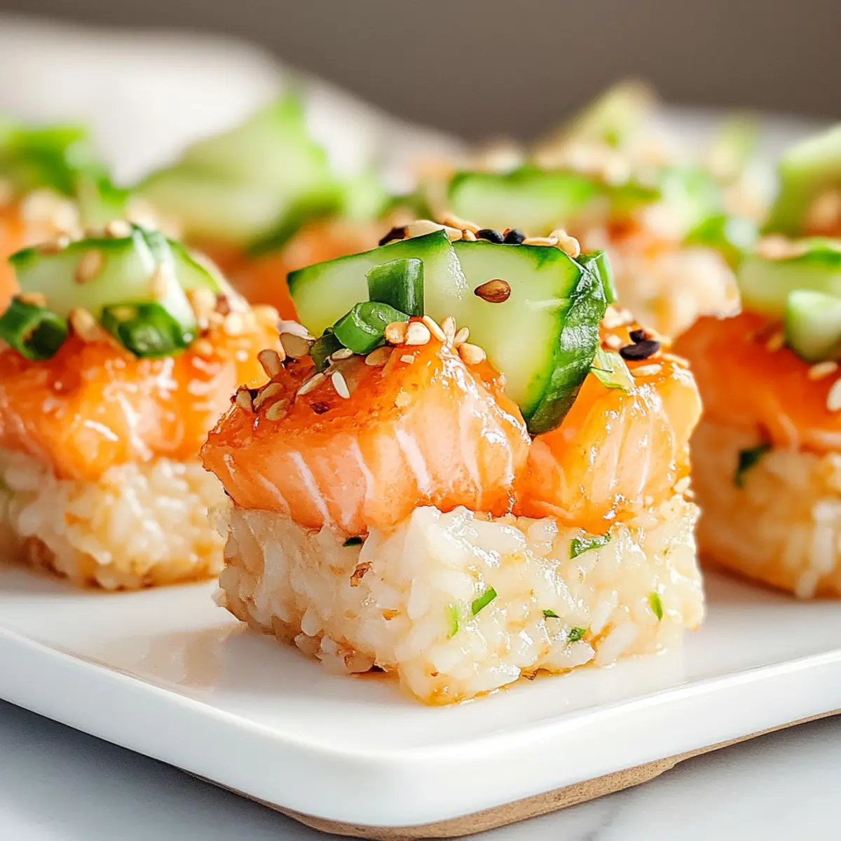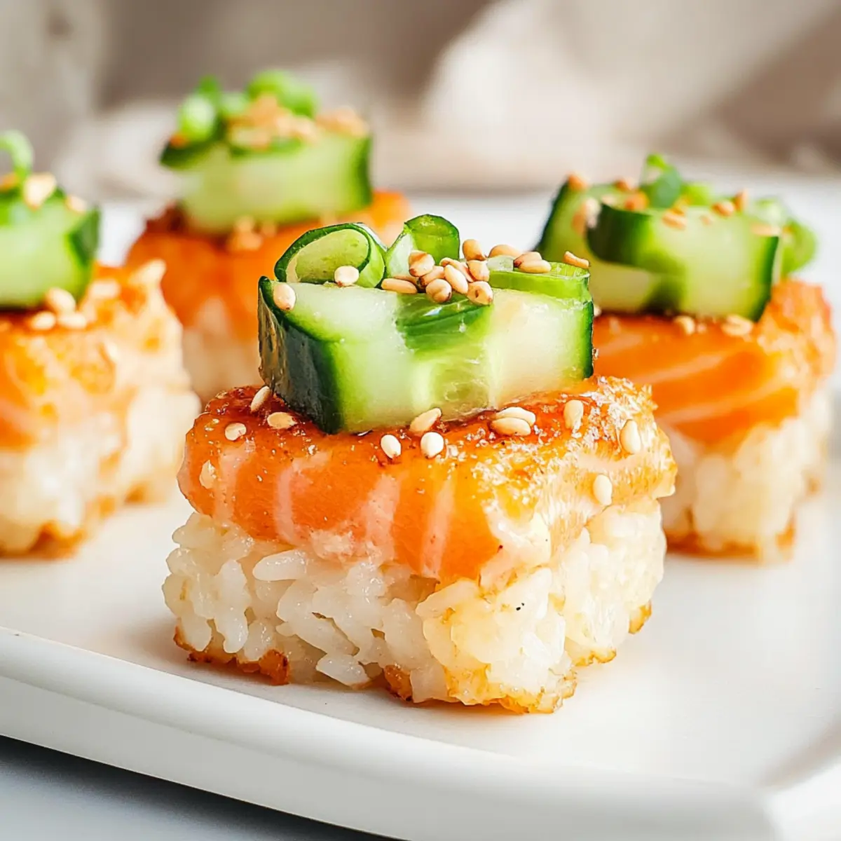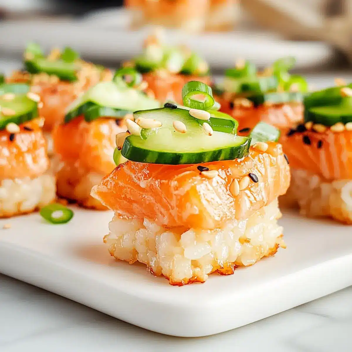- Assemble by placing cucumber on each rice piece, topping with salmon mixture, and garnishing with sesame seeds and green onions.