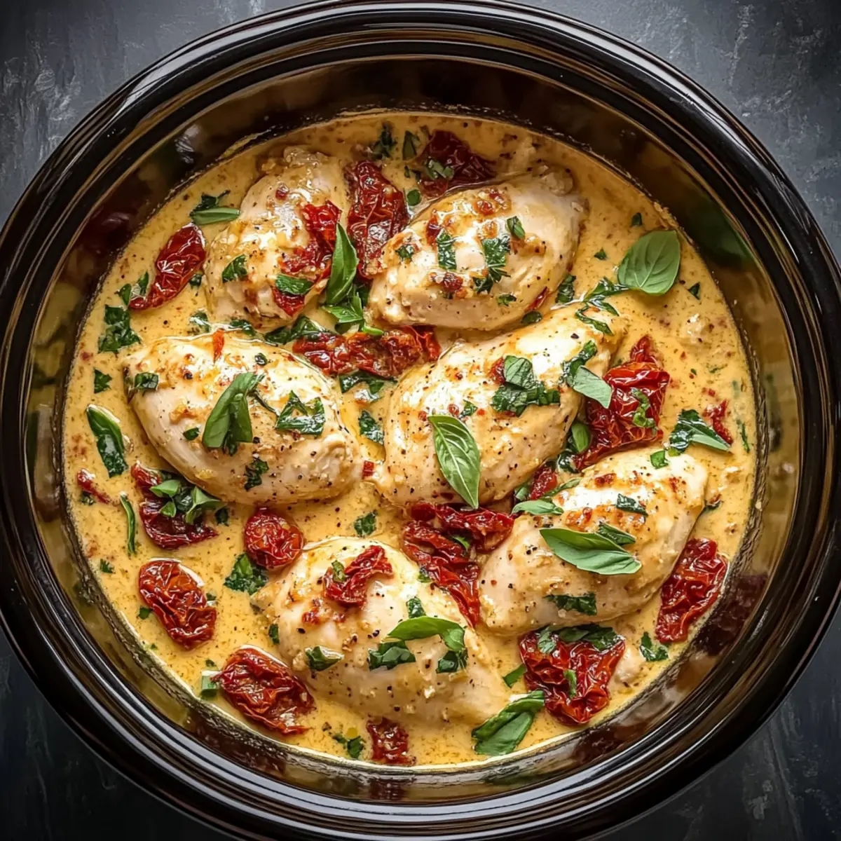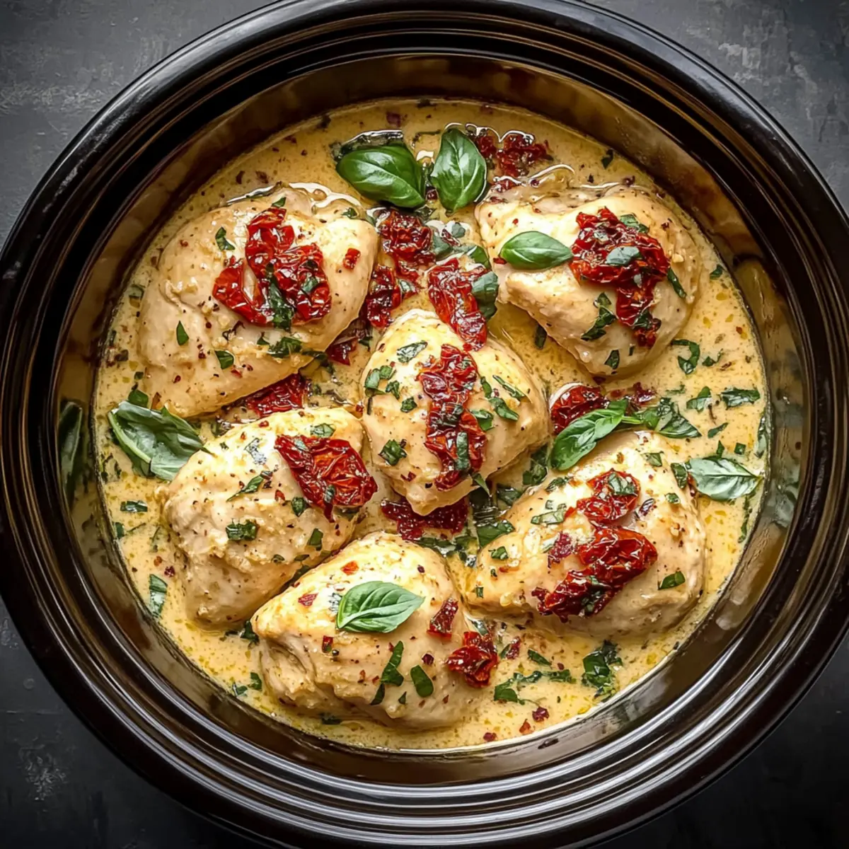 Place the seasoned chicken breasts into the bottom of your slow cooker. Scatter the minced garlic and chopped sun-dried tomatoes evenly on top of the chicken, allowing their flavors to meld in the cooking process. This layering technique ensures that the chicken absorbs all the delicious elements of the sauce as it cooks.