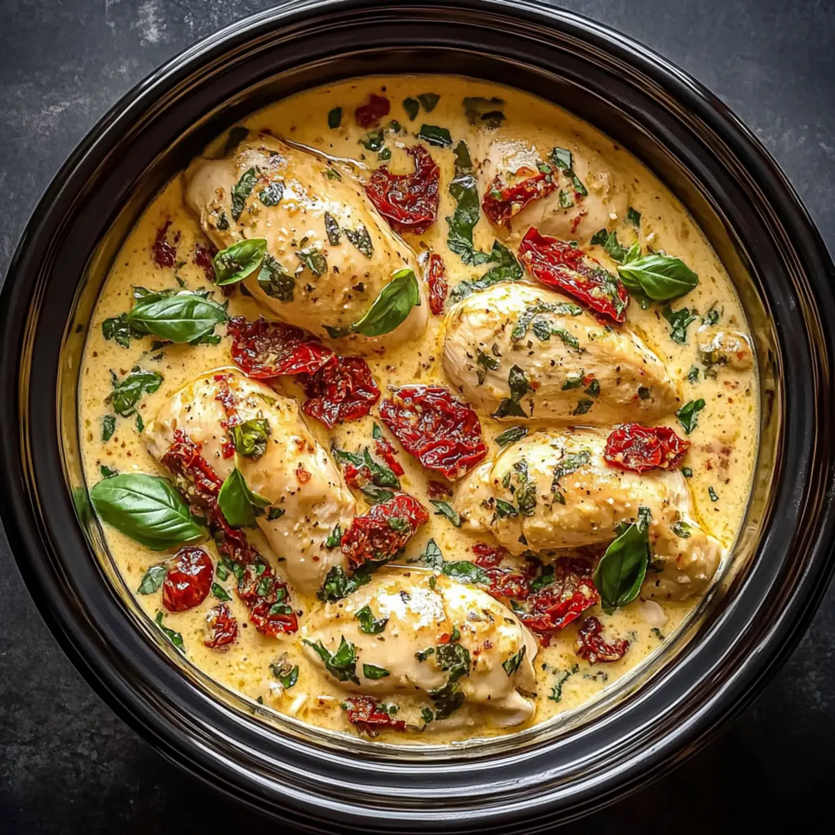 - Place the seasoned chicken breasts into the bottom of your slow cooker. Scatter the minced garlic and chopped sun-dried tomatoes evenly on top of the chicken.