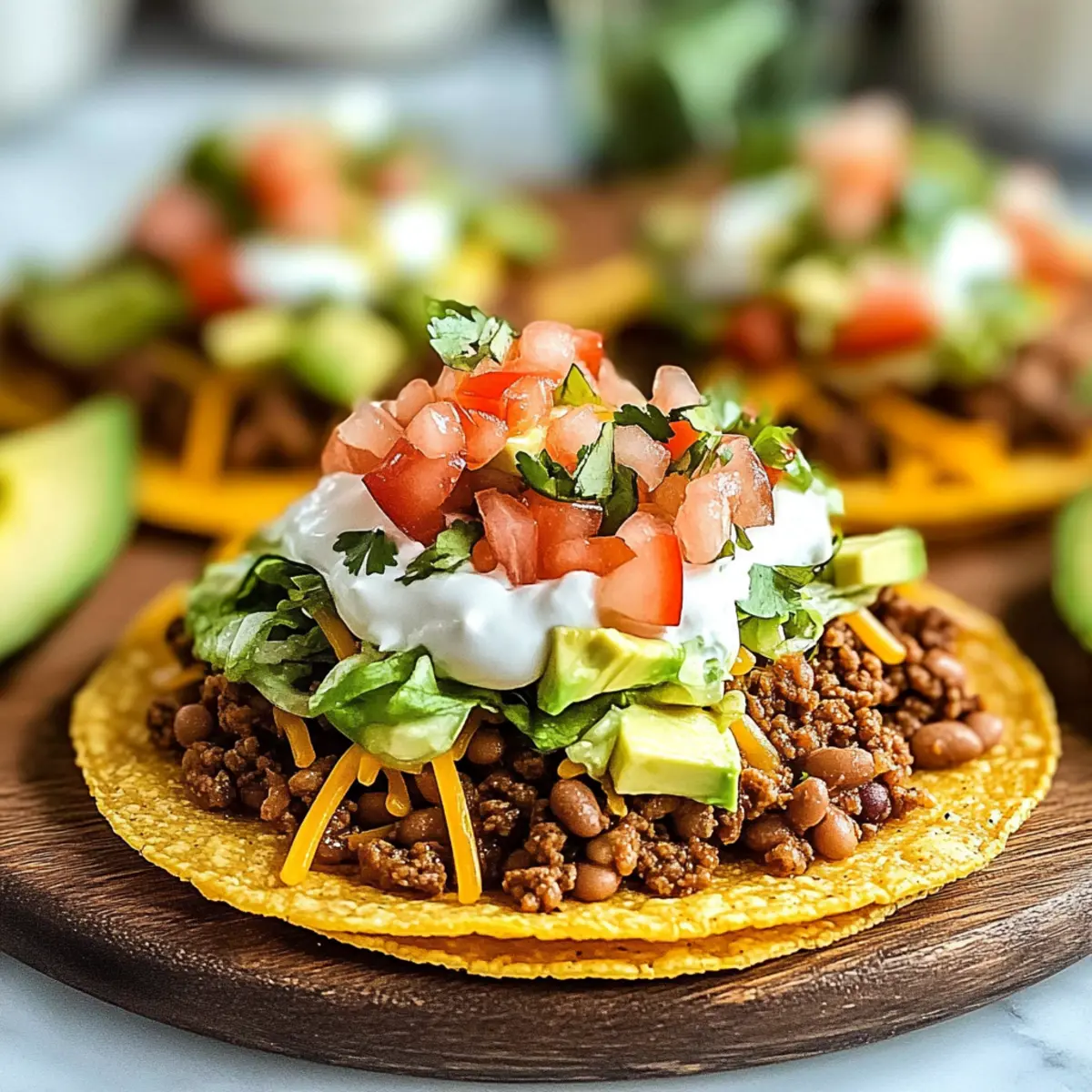 - Spread warmed refried beans over each tostada shell, top with ground beef mixture, shredded lettuce, diced tomatoes, avocado, and shredded cheese.