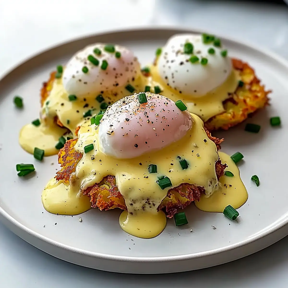 To create your Easy Latke Eggs Benedict, place a warm latke on each plate as the base. Top it generously with a slice of cold smoked salmon if desired, followed by the perfectly poached egg. Drizzle with the creamy hollandaise sauce, ensuring each component shines. Finally, garnish with fresh chives and a sprinkle of flaky salt, serving the dish hot for a delightful brunch experience.