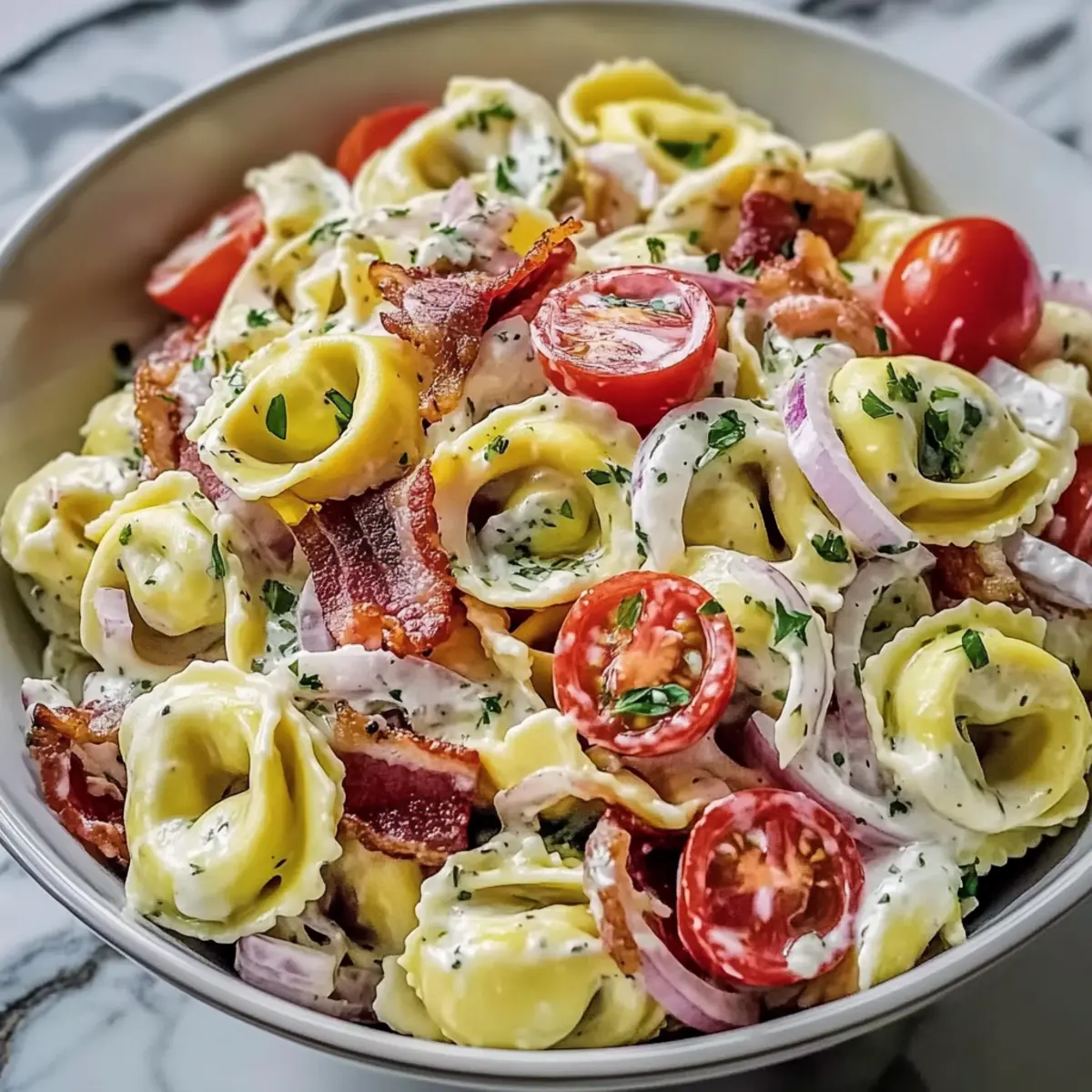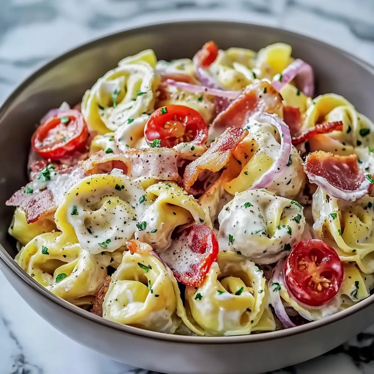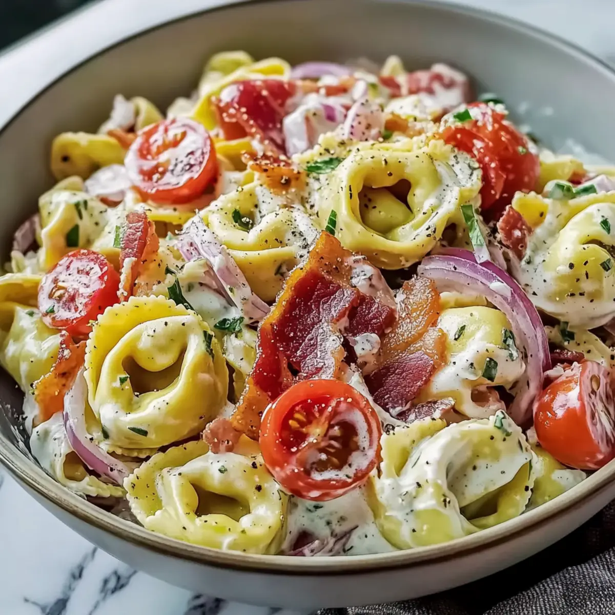 Gently fold the prepared tortellini, chopped bacon, sliced pepperoncini, diced red onion, halved cherry tomatoes, and grated Parmesan cheese into the bowl with the dressing. Stir everything together carefully until all ingredients are evenly coated, allowing the vibrant colors and textures to mix beautifully.