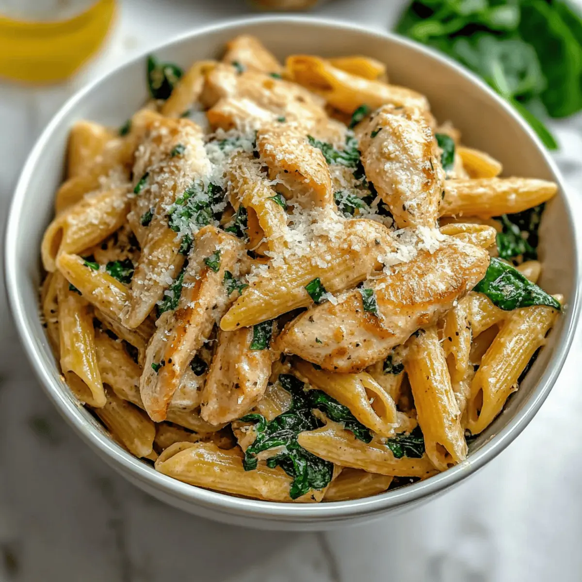 - Return the chicken and any reserved juices to the skillet, followed by the drained pasta and chopped spinach. Toss to combine until well coated.