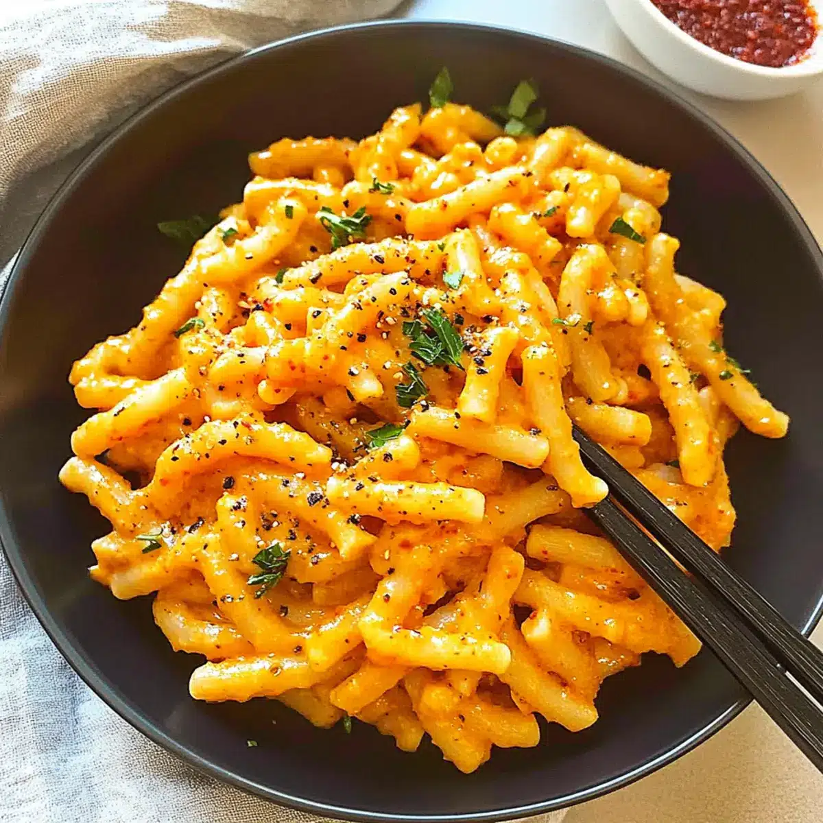 Add the cooked pasta to the sauce, tossing everything together until it is well coated in the creamy Gochujang sauce. If the sauce seems too thick, you can add a splash of the reserved pasta water to achieve your desired consistency. Ensure that every twist of the pasta is enveloped in that rich, spicy goodness.