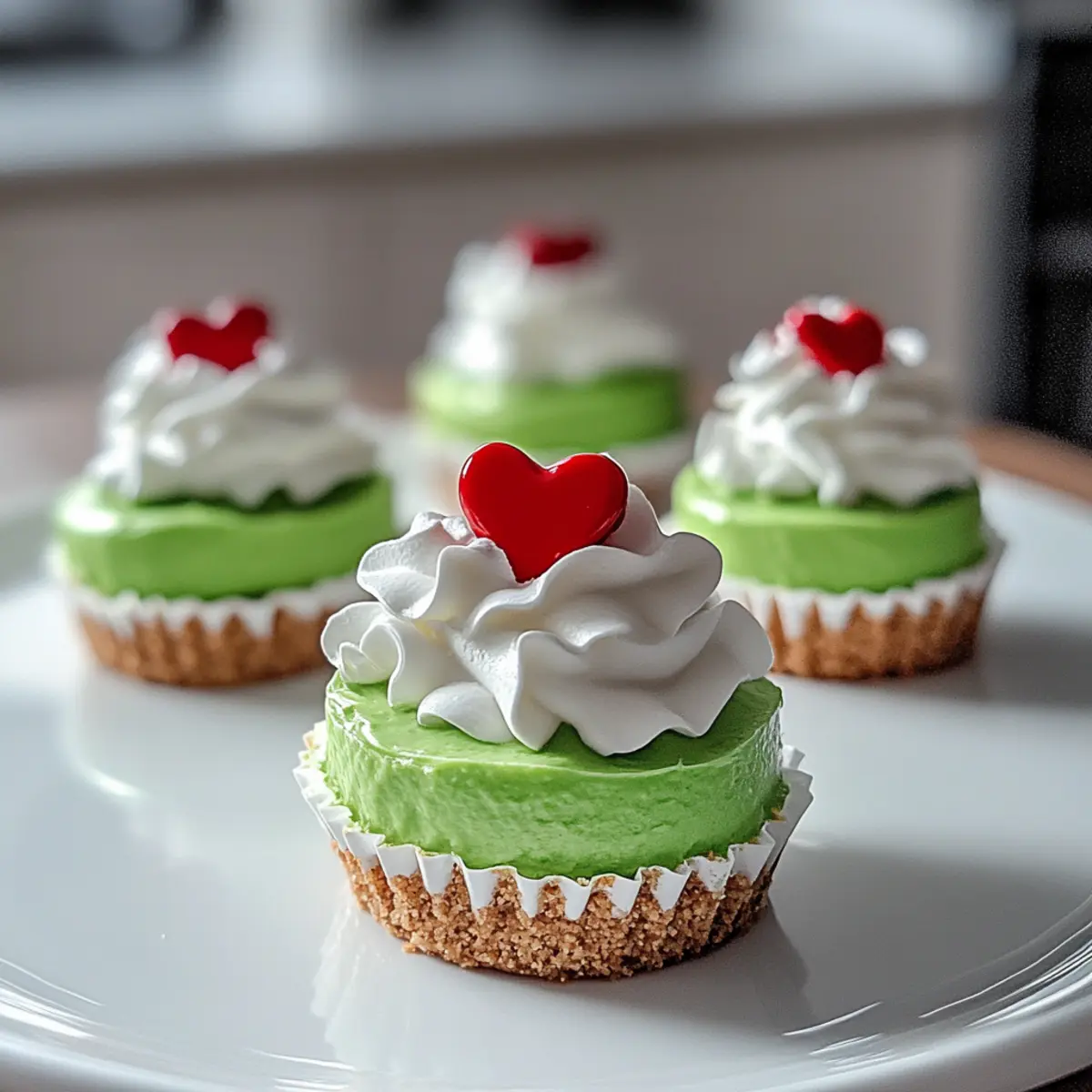 These Grinch Mini Cheesecakes are ideal for meal prep, allowing you to enjoy more quality time with family during the holidays! You can prepare the crust and cheesecake filling up to 24 hours in advance. Simply mix the graham cracker crumbs with melted butter and press them into the liners, then prepare and spoon in the vibrant cheesecake filling. Cover them tightly with plastic wrap and refrigerate to maintain their freshness. When it’s time to serve, simply add the whipped cream topping and the decorative red heart candy. This way, your festive dessert will taste just as delicious, ready to delight your guests with minimal last-minute effort!