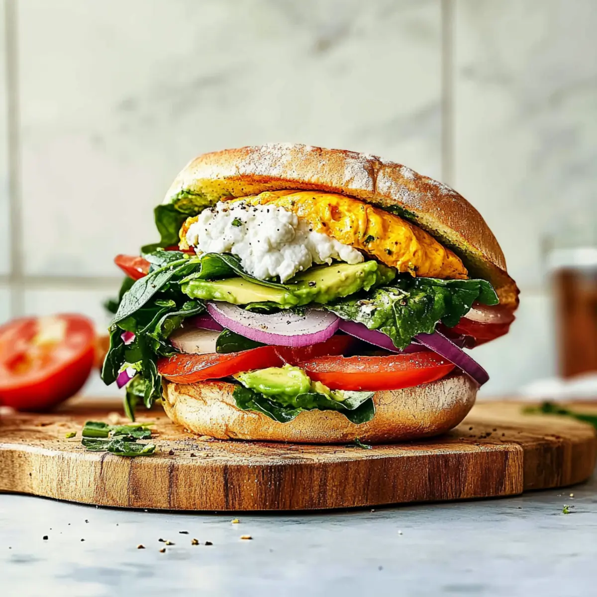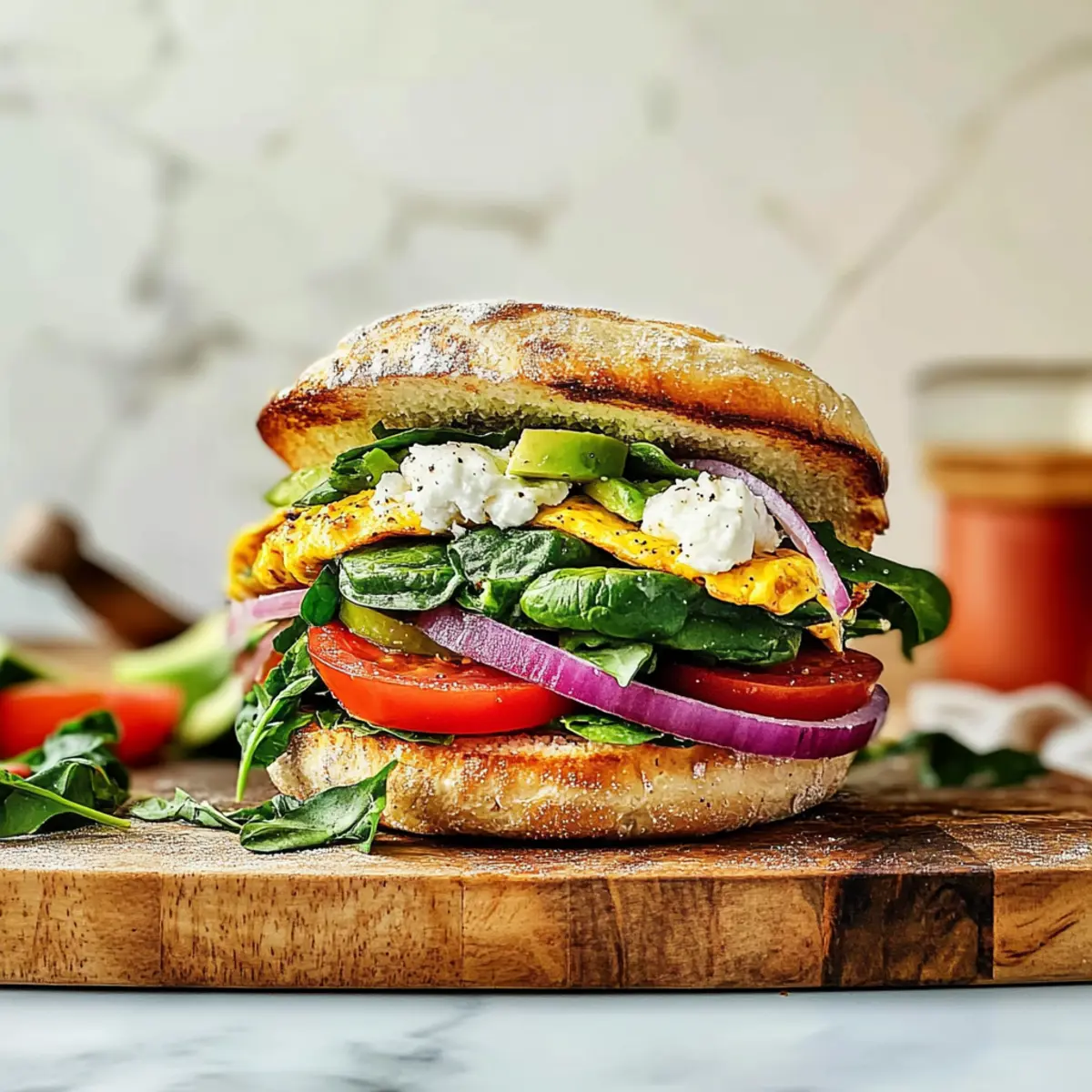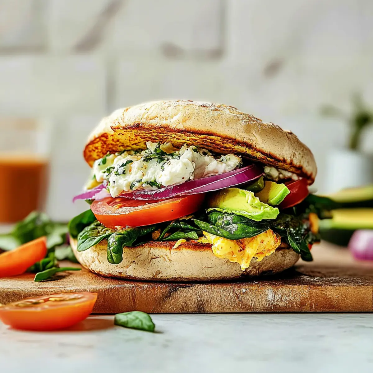 Toast 4 whole English muffins until golden and crispy. Spread a generous layer of the goat cheese mixture on the cut sides of the muffins. Place one slice of the spinach omelet on each muffin half, layering with fresh tomato slices, optional red onion, and avocado if desired. The combination of these ingredients will elevate your ultimate make-ahead breakfast sandwich.