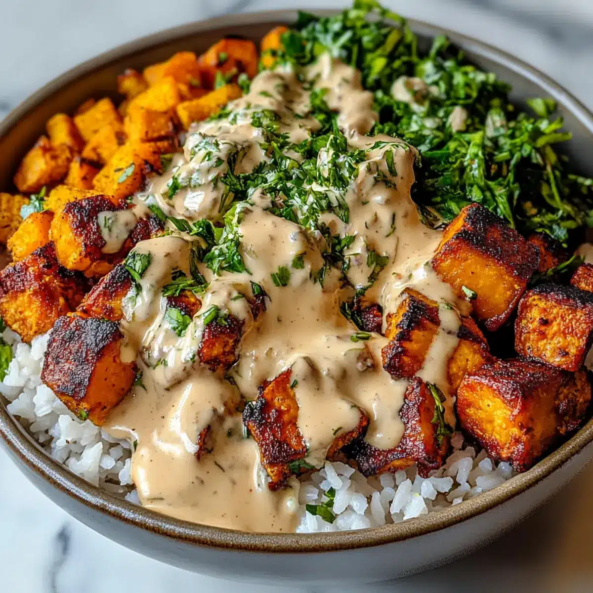 - To assemble, start by adding a generous portion of cooked rice to each bowl. Top with roasted sweet potatoes, perfectly cooked chicken, and optional green vegetables. Drizzle the creamy spiced sauce generously over the contents, and finish by garnishing with fresh cilantro or parsley.