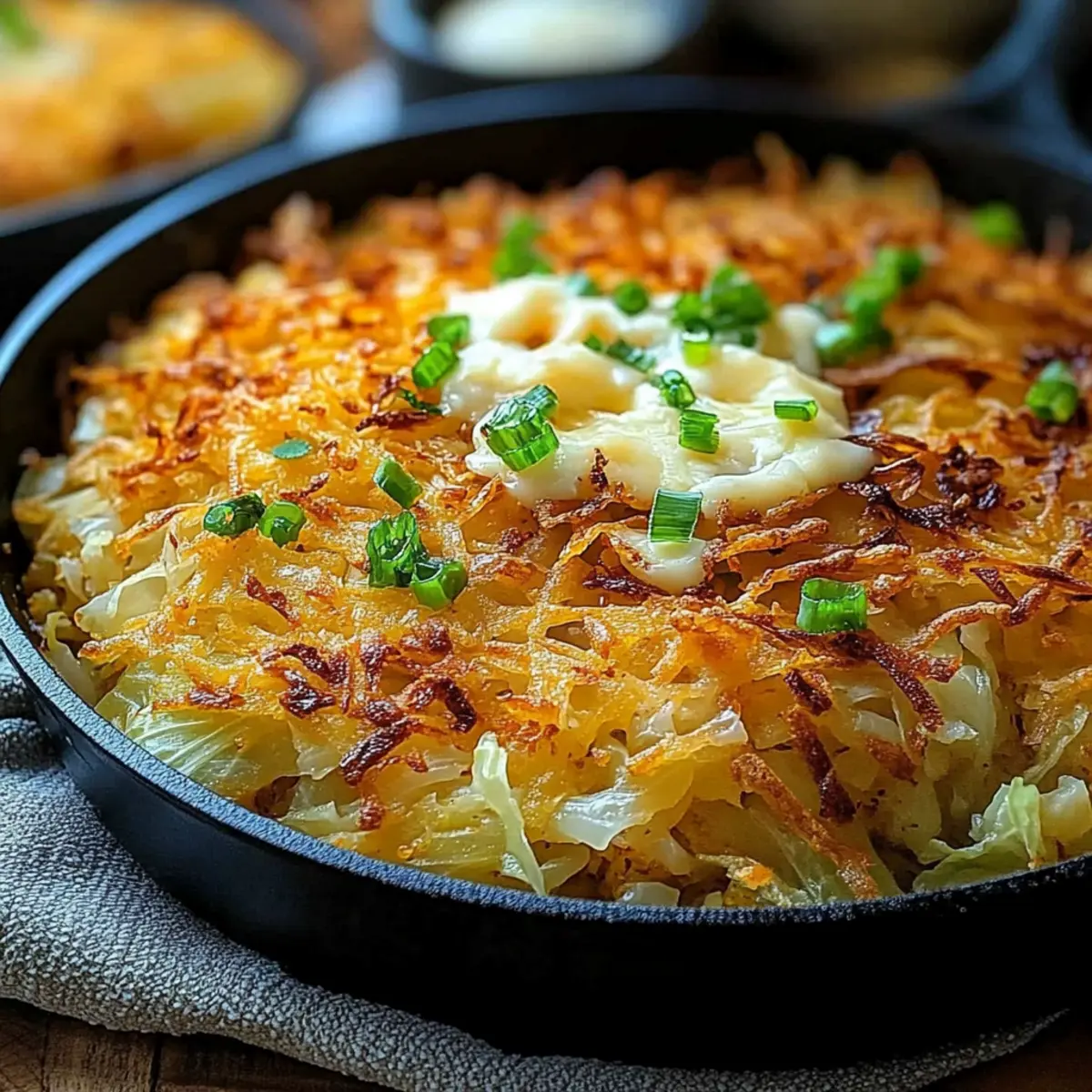 - Combine the crispy hash browns with the sautéed cabbage in the skillet.