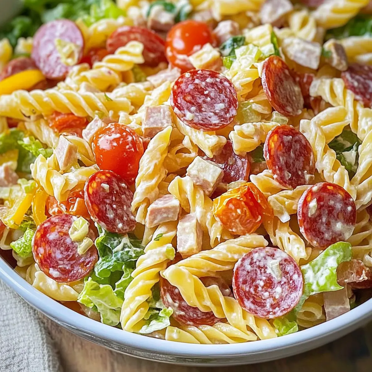 Very! For a gluten-free option, swap in gluten-free pasta. If you’re making this salad for someone with dairy allergies, consider using dairy-free cheese or nutritional yeast for that umami kick. Always confirm the ingredients from pre-sliced meats and dressings as they may contain allergens. If preparing for pets, avoid ingredients like onions, olives, and certain seasoning blends that can be harmful to dogs and cats.