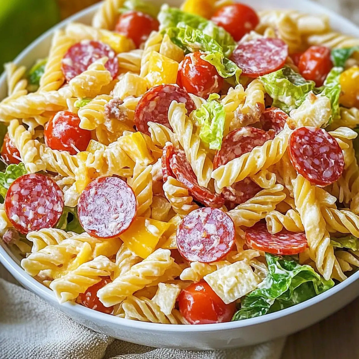 If you find your pasta salad is too dry, just add a splash of olive oil or a drizzle of extra dressing. If it’s overly soggy, next time, check to ensure your pasta is completely cooled before mixing! It’s also key to add the lettuce right before serving to maintain its crispness.