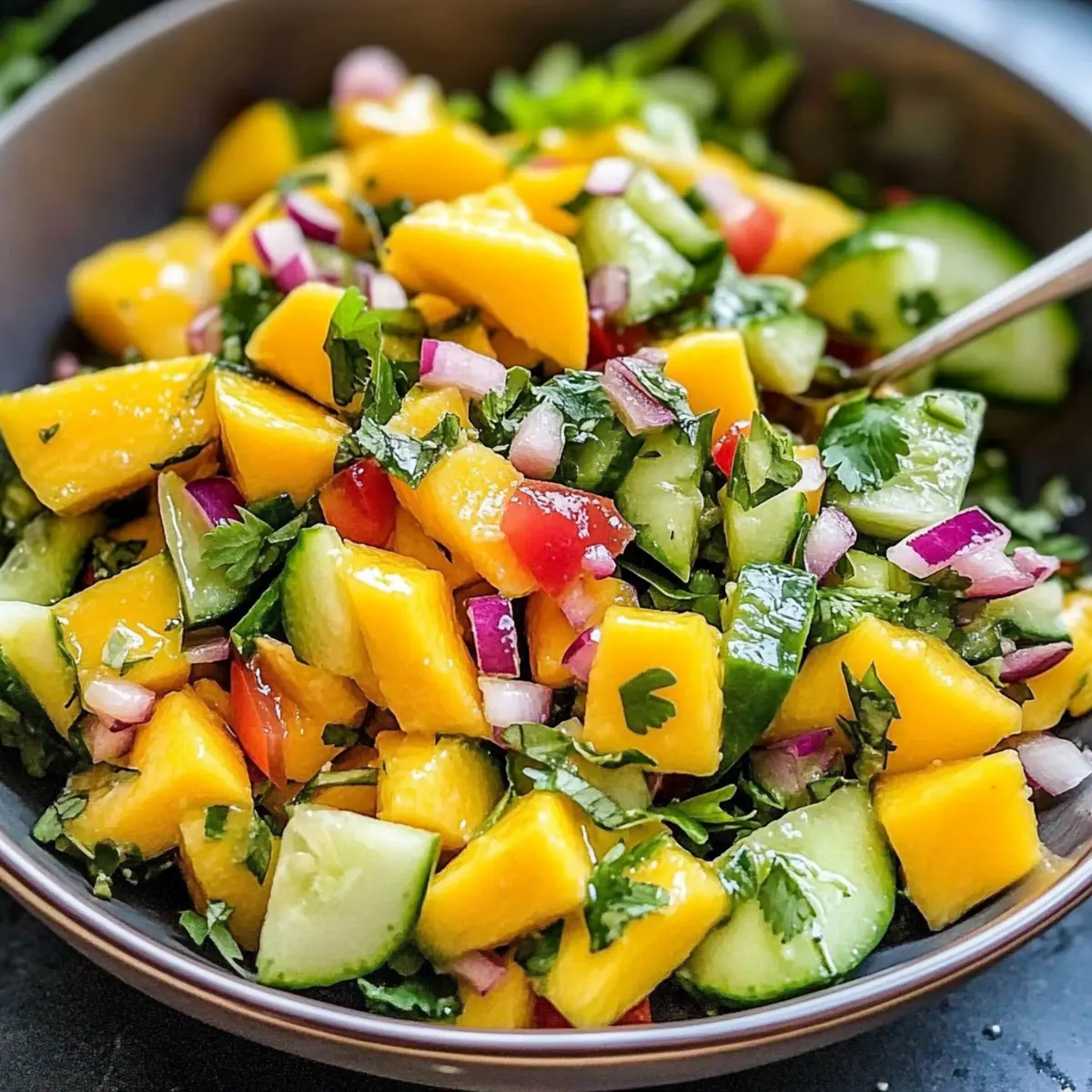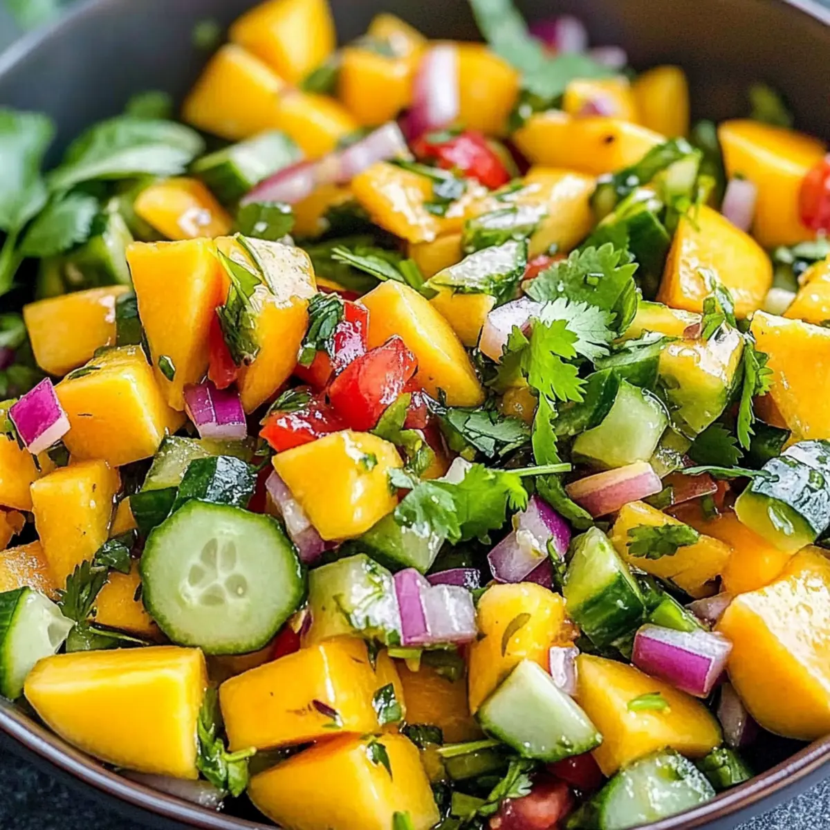 These Mango Salad components are perfect for meal prep, making your busy weeknights a breeze! You can prepare the diced mangoes and sliced cucumbers up to 24 hours in advance. Just store them in airtight containers in the refrigerator, ensuring they remain fresh and vibrant. The lime dressing can also be whisked together and refrigerated separately for up to three days. When you’re ready to serve, simply combine the prepped ingredients and dressing, toss gently, and garnish with cilantro and lime wedges. This way, you’ll have a delicious, refreshing mango salad that’s just as tasty as when made fresh, saving you time without sacrificing flavor!