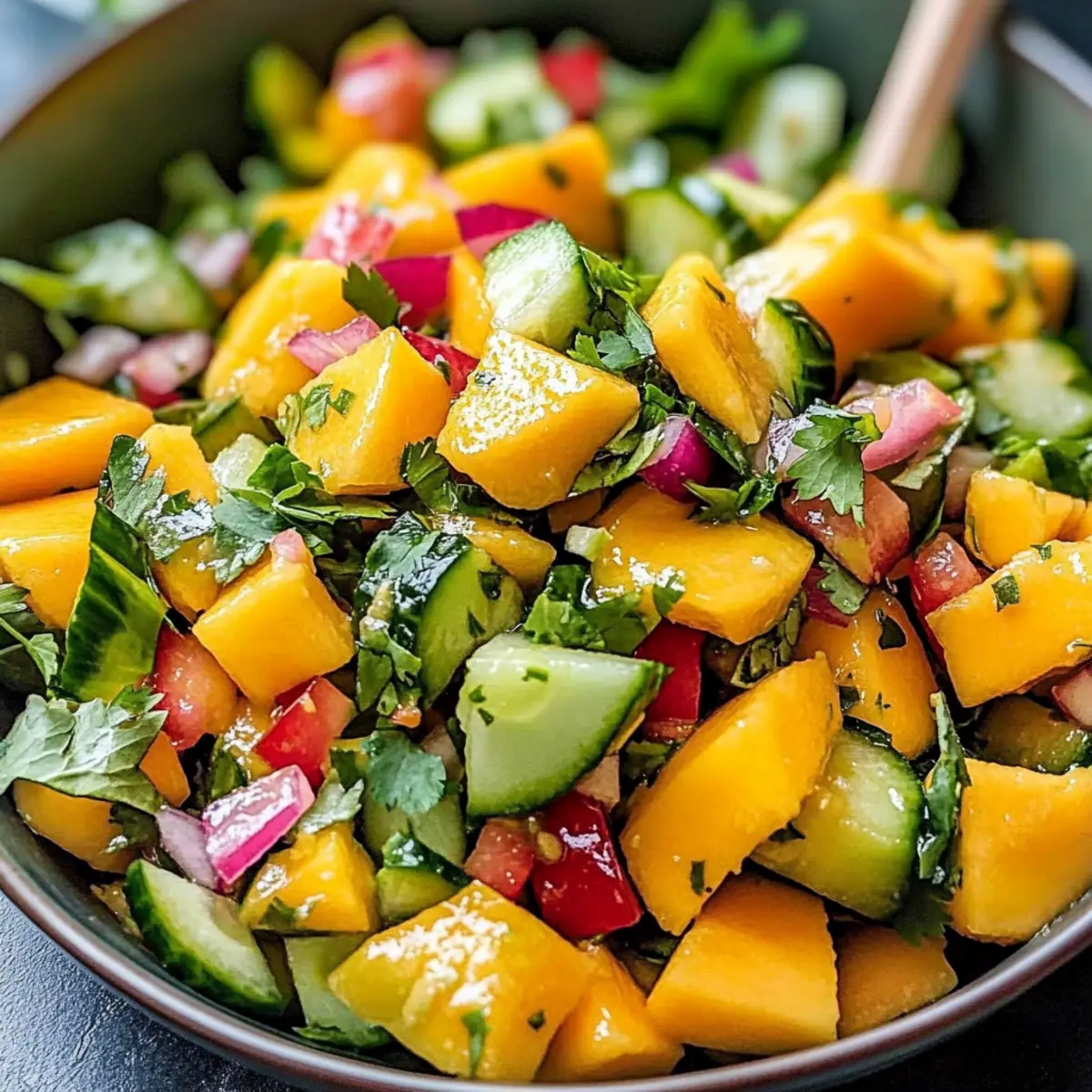 Vibrant Flavors: This Mango Salad bursts with the sweet juiciness of perfectly ripe mangoes, balanced by the refreshing crunch of cucumbers.