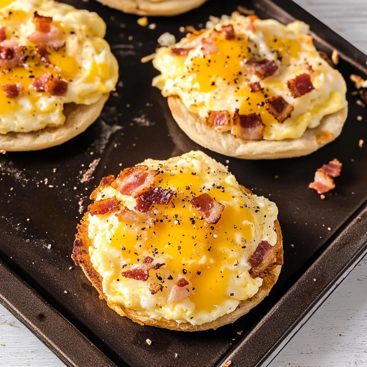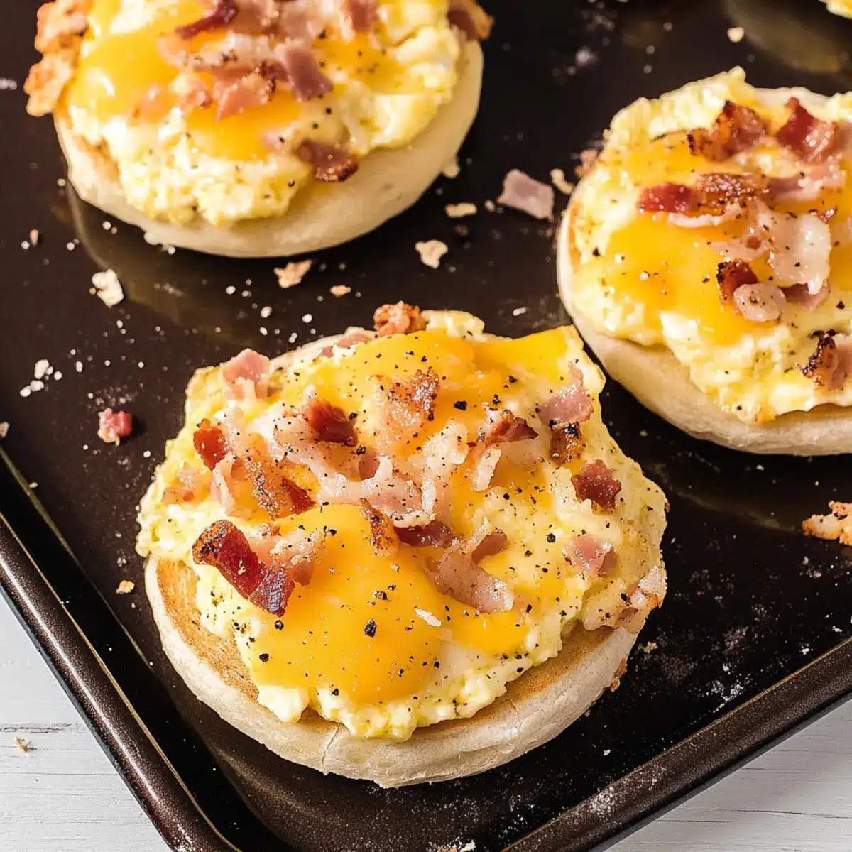 - Distribute shredded cheddar cheese across the muffin halves, add scrambled eggs, crumbled bacon, and top with Monterey Jack cheese.