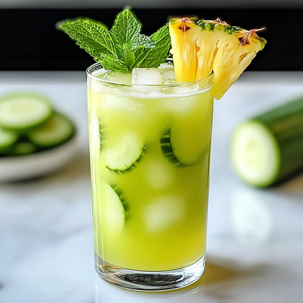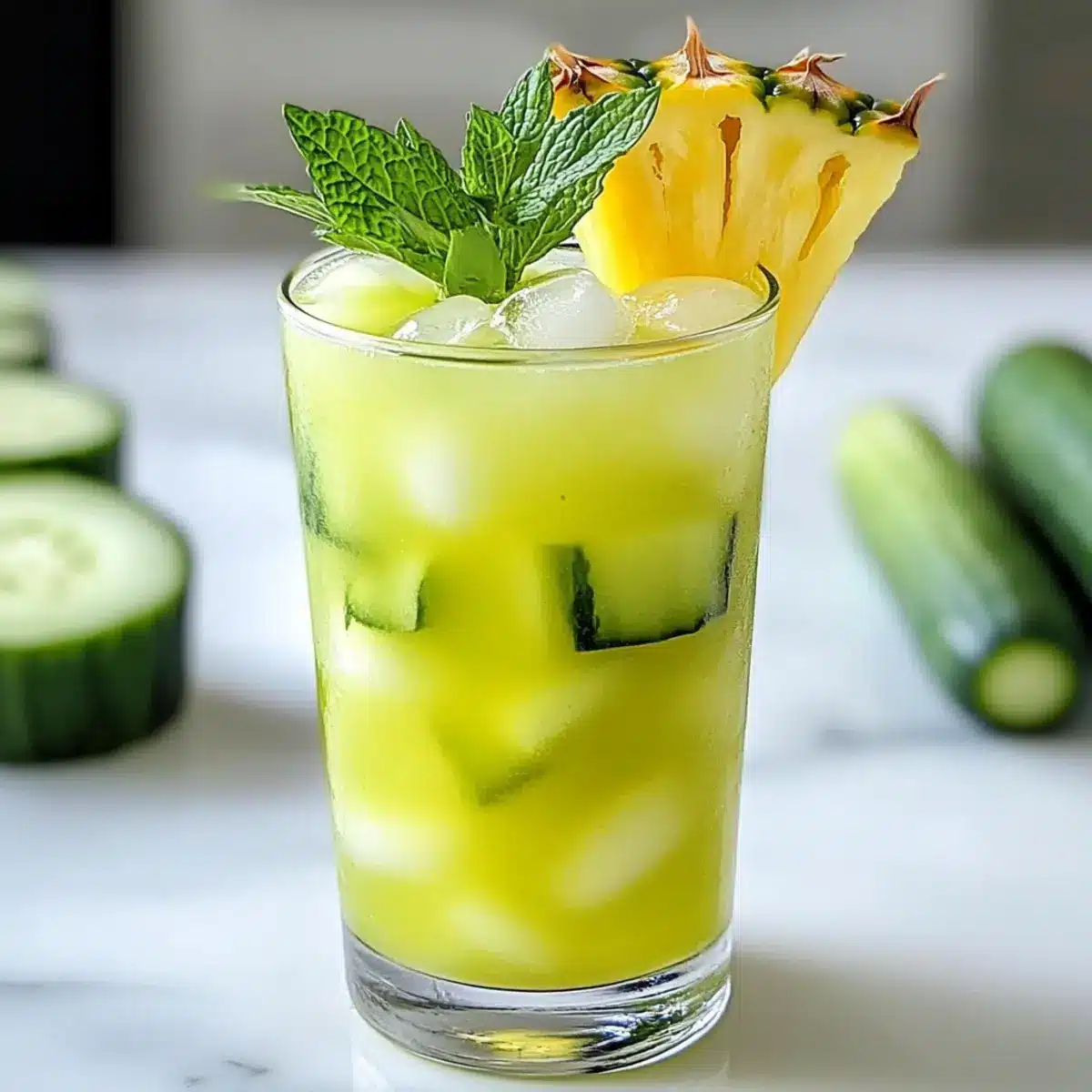 - In a high-speed blender, combine the large English cucumber, ripe pineapple chunks, freshly squeezed lime juice, grated fresh ginger, and fresh mint leaves. Add about 4 cups of water to achieve the desired consistency. Blend on high for 30–40 seconds until the mixture is smooth and vibrant.