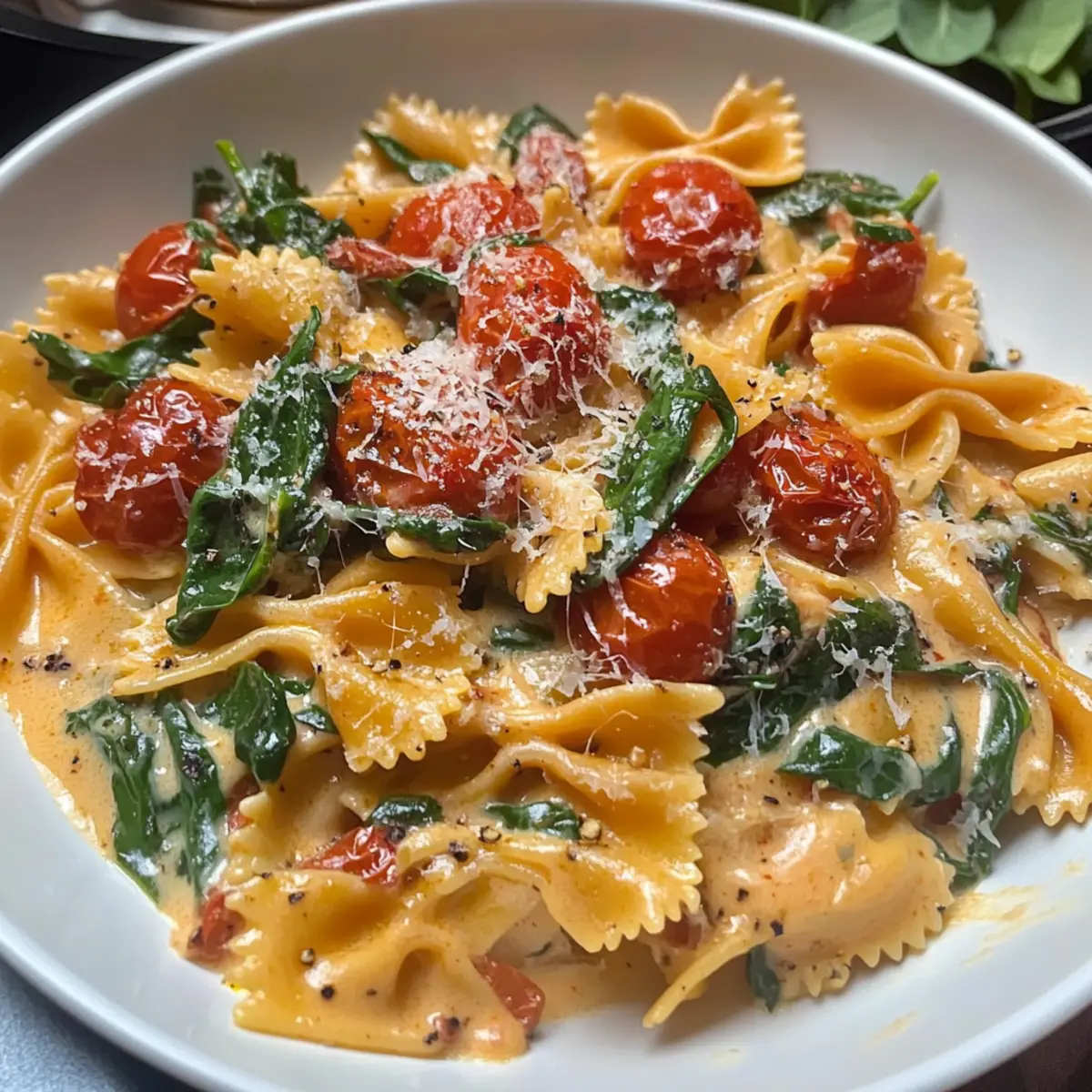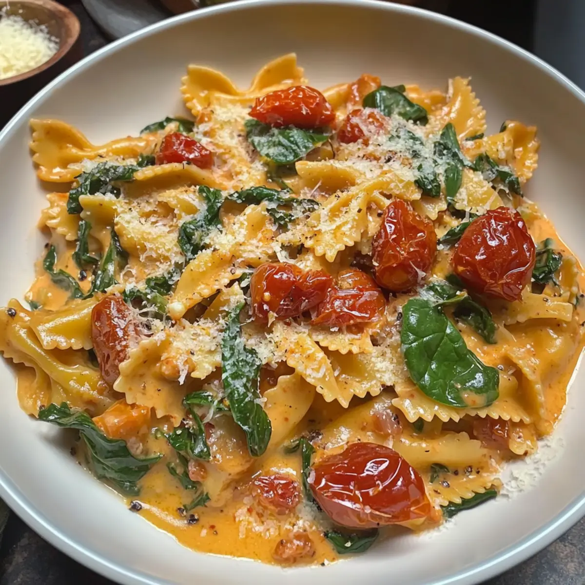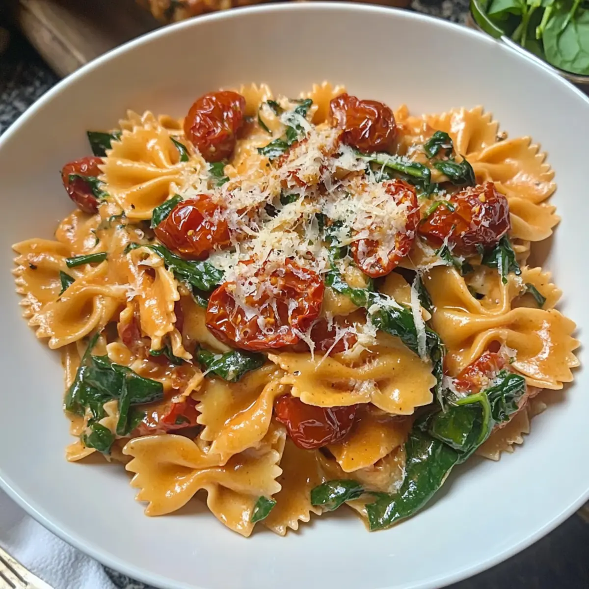 While your sauce is coming together, cook your pasta in a large pot of salted boiling water until al dente, according to package instructions. Once the pasta is ready, drain it, reserving about a cup of the pasta water. Toss the hot pasta into the sauce along with the slow-roasted tomatoes and spinach, mixing well. Use the reserved pasta water to adjust the sauce’s consistency until it’s just right.