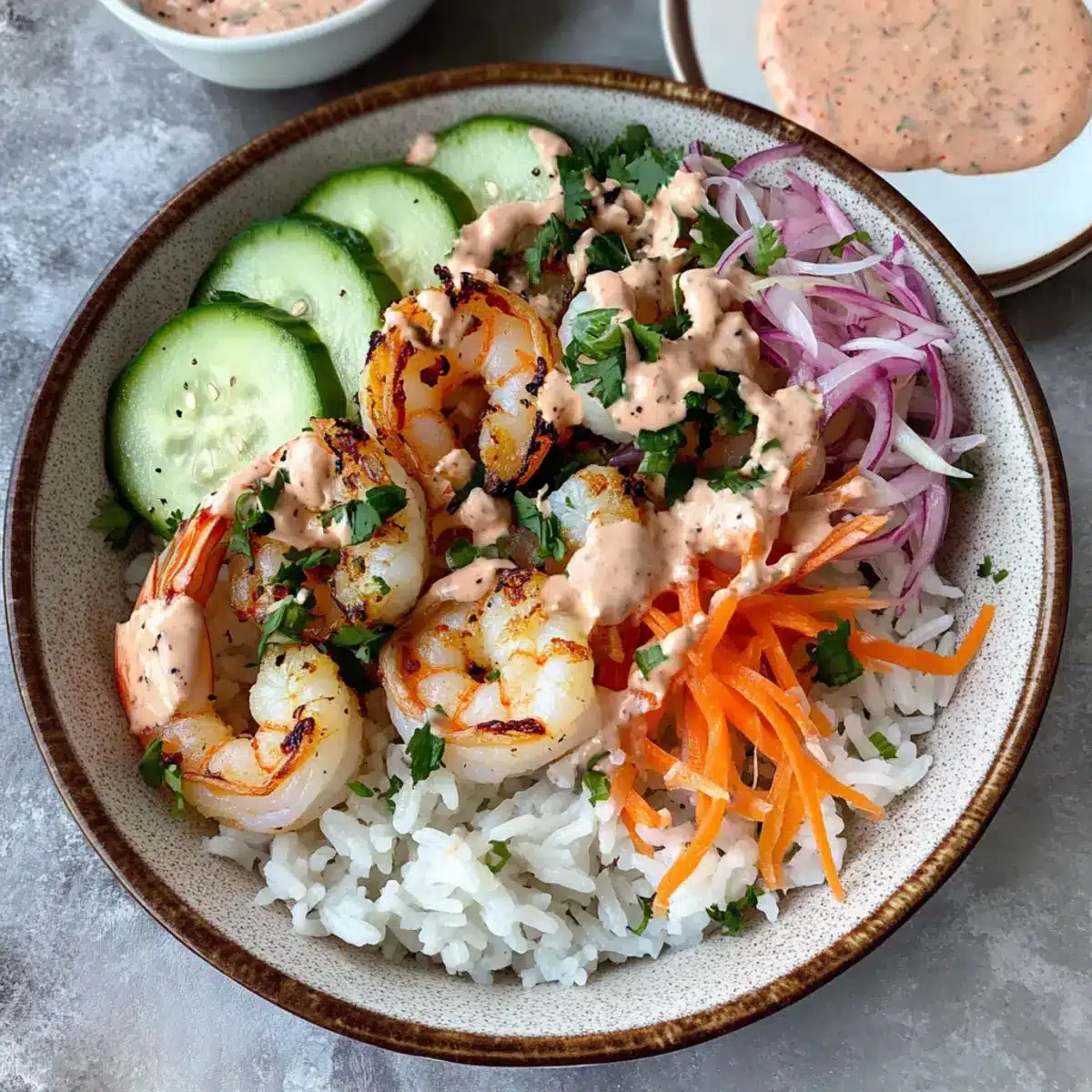 Now it’s time to bring your bowl to life! In a serving bowl, start with a generous layer of fluffy jasmine rice as the base. Carefully arrange the cooked shrimp on top, followed by the vibrant shredded carrots and cucumber. Finish with a sprinkle of pickled onions and fresh herbs like cilantro or parsley to add an aromatic touch.