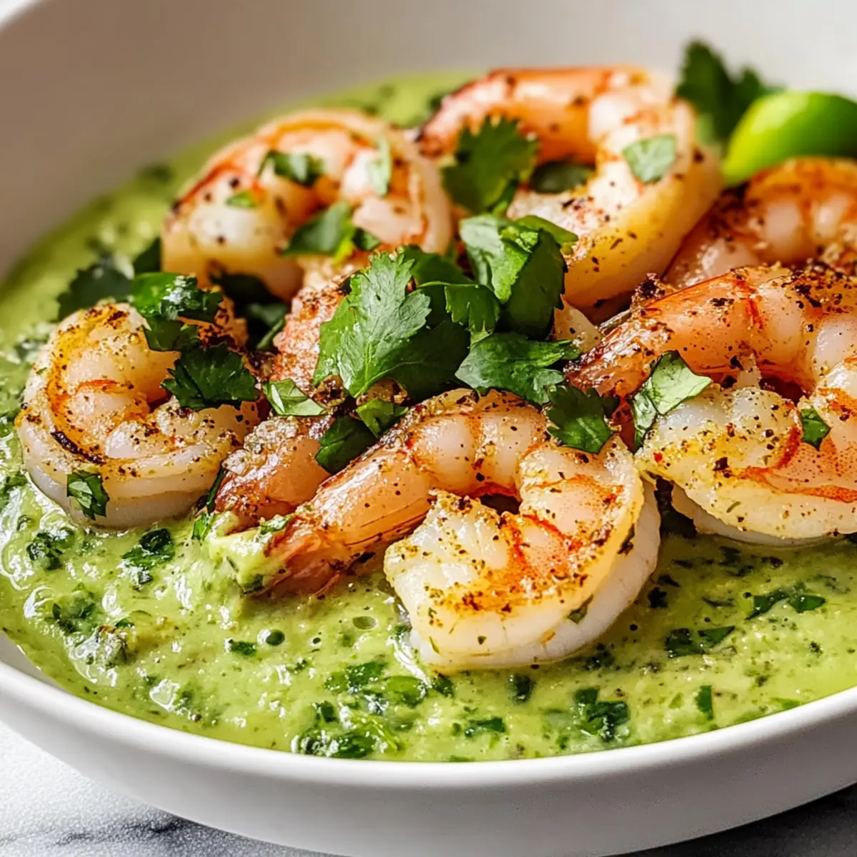 - To serve, spoon the creamy salsa into bowls and top with sautéed prawns. Garnish with lime wedges, cracked black pepper, and chopped cilantro.