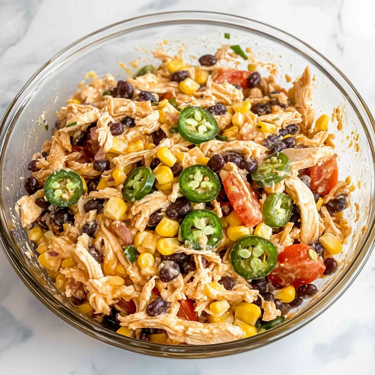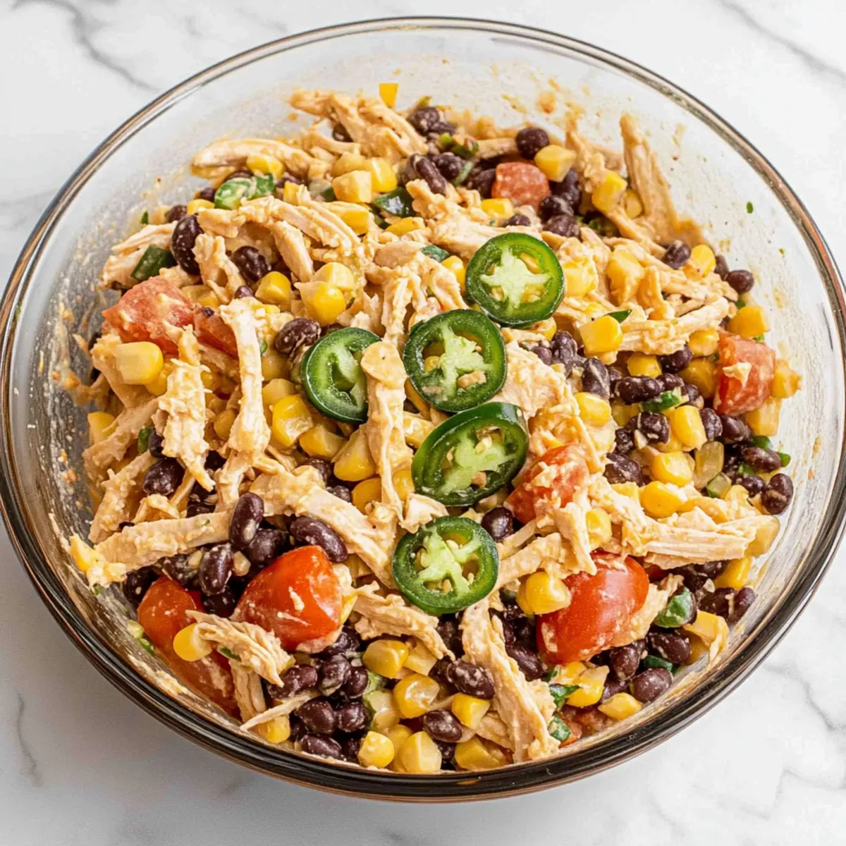 In a large mixing bowl, add 2 cups of cooked shredded chicken, 1 can of rinsed and drained black beans, and 1 cup of sweet corn. Next, chop 1-2 fresh jalapeños (to your heat preference), quarter 1 cup of cherry tomatoes, and finely dice ¼ cup of red onion, adding them to the mix. Toss all the hearty ingredients gently together to create a colorful and inviting base for your salad.