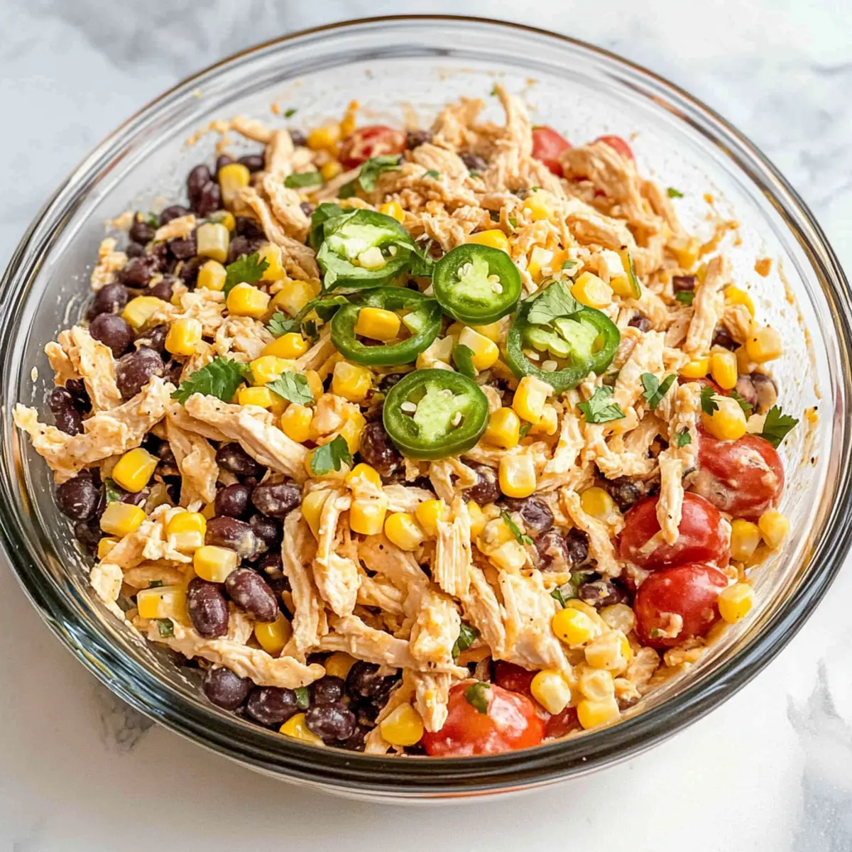 - In a large mixing bowl, add 2 cups of cooked shredded chicken, 1 can of rinsed and drained black beans, and 1 cup of sweet corn. Chop 1-2 fresh jalapeños, quarter 1 cup of cherry tomatoes, and finely dice ¼ cup of red onion. Toss gently together.