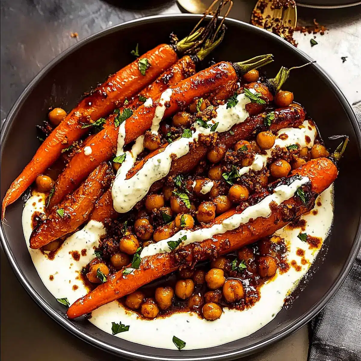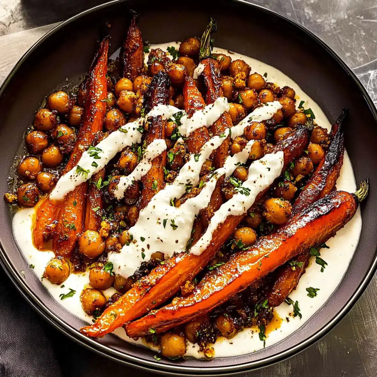 - Assemble by layering yogurt sauce, roasted carrots, and crispy chickpeas, garnishing as desired.