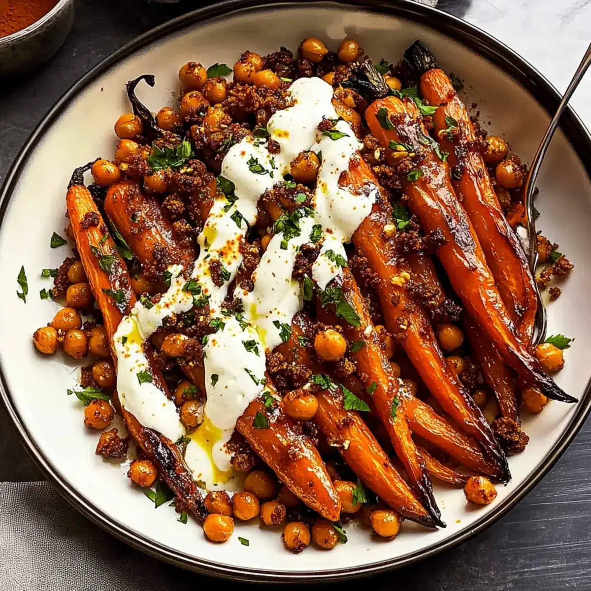Once the carrots and chickpeas are roasted to perfection, it’s time to assemble your dish. On a serving plate, spread a generous layer of the yogurt sauce, then arrange the roasted carrots on top. Lastly, add the crispy chickpeas, and if you desire, drizzle with extra yogurt sauce and garnish with fresh cilantro and crushed pistachios for added color and crunch.