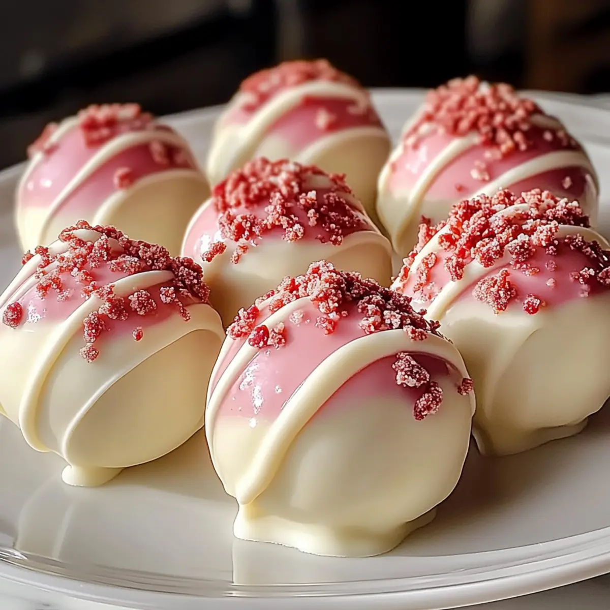 While the white chocolate coating is still wet, sprinkle crushed freeze-dried strawberries over each truffle for an extra pop of color and flavor. The heat from the chocolate will help the garnishes adhere nicely. If desired, be generous with the garnish for an appealing presentation that maximizes the strawberry essence in these Strawberry Cheesecake Truffle Balls.