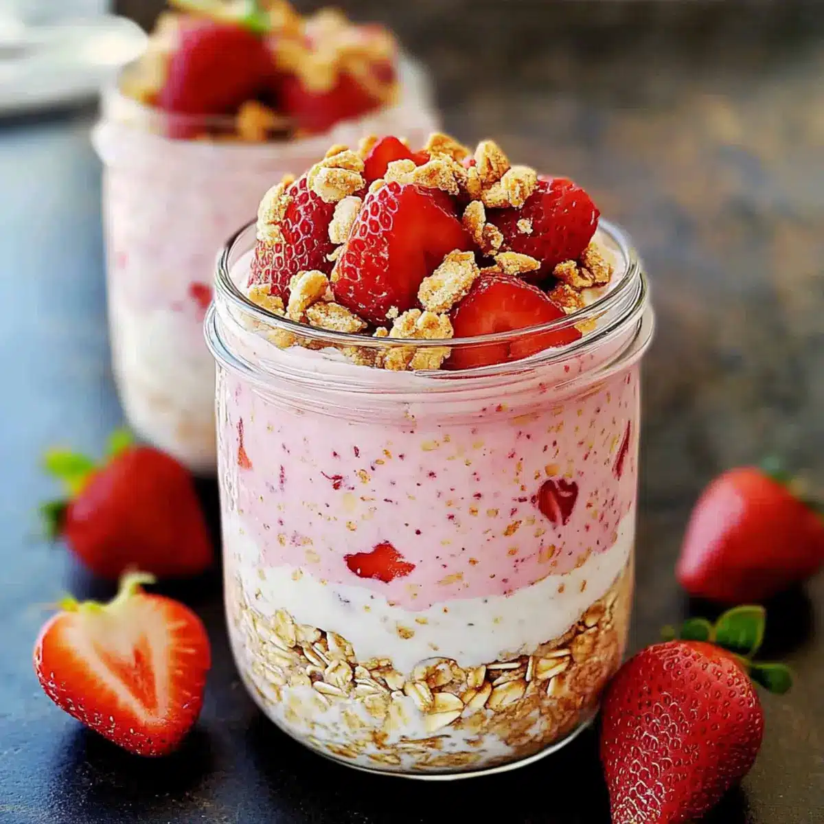 Strawberry Cheesecake Overnight Oats are a fantastic option for meal prep, saving you time on bustling mornings! You can prepare the oat mixture up to 3 days in advance by combining the rolled oats, almond milk, Greek yogurt, cream cheese, honey, and vanilla—just make sure to keep everything well sealed in jars. For peak freshness, fold in the chopped strawberries and chia seeds only the night before serving to prevent them from becoming mushy. This way, when morning arrives, all you need to do is stir, top with crushed graham crackers or granola, and enjoy a delicious, creamy breakfast with minimal effort!