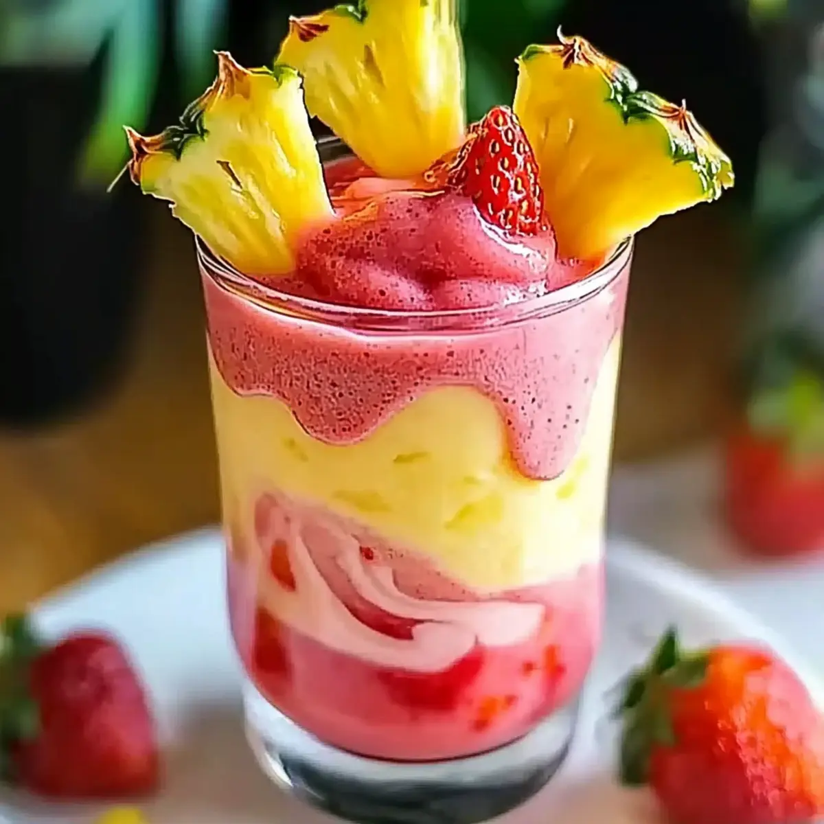 - Serve and Garnish: Pour the smoothie into chilled glasses for the best presentation. Garnish your smoothie with fresh pineapple wedges and a few slices of strawberries.