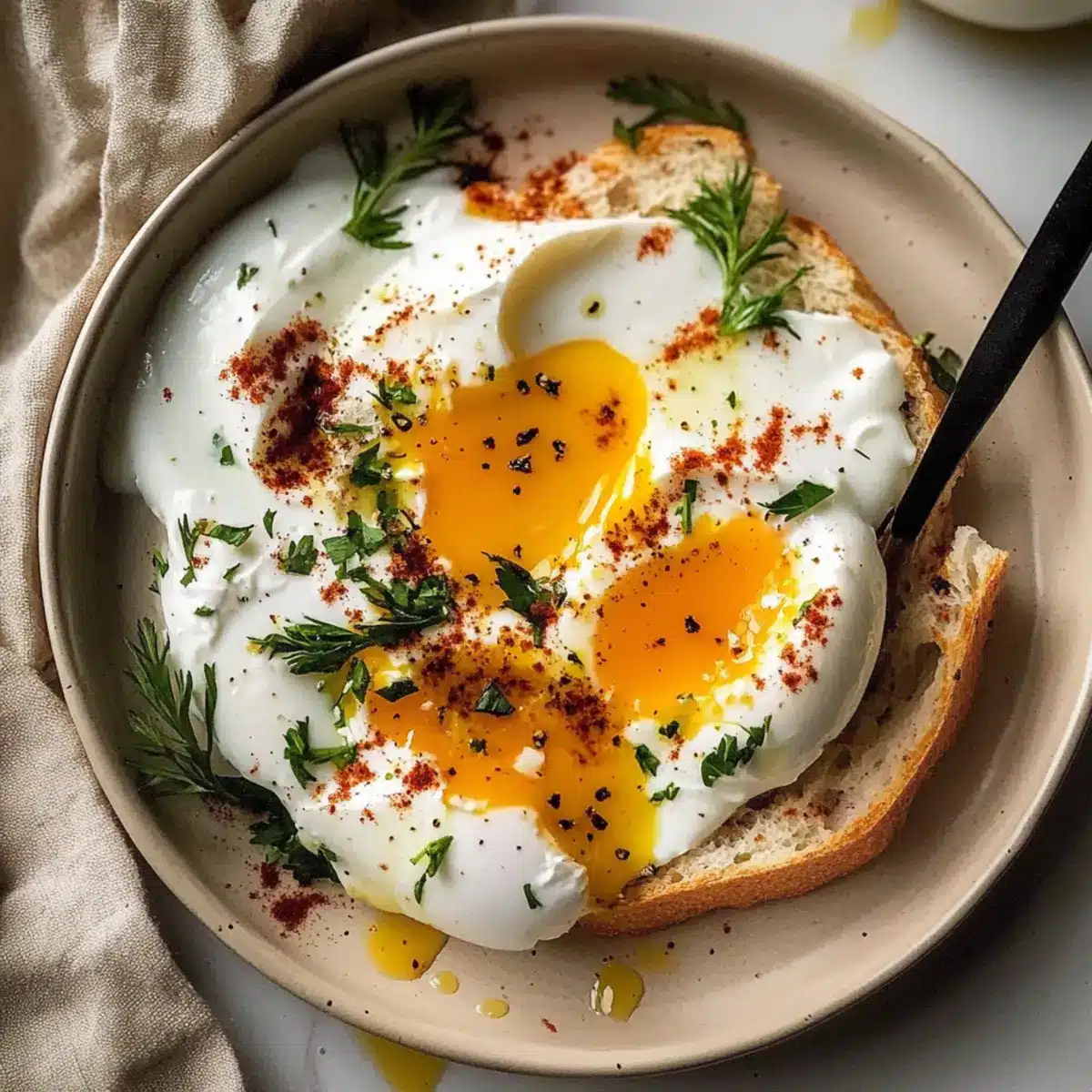 Warm Pita Bread: Perfect for scooping up the creamy yogurt and runny yolk, enhancing the dish’s texture and flavor. Freshly baked pita adds a touch of authenticity.