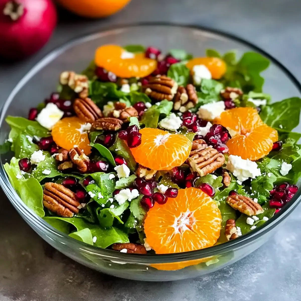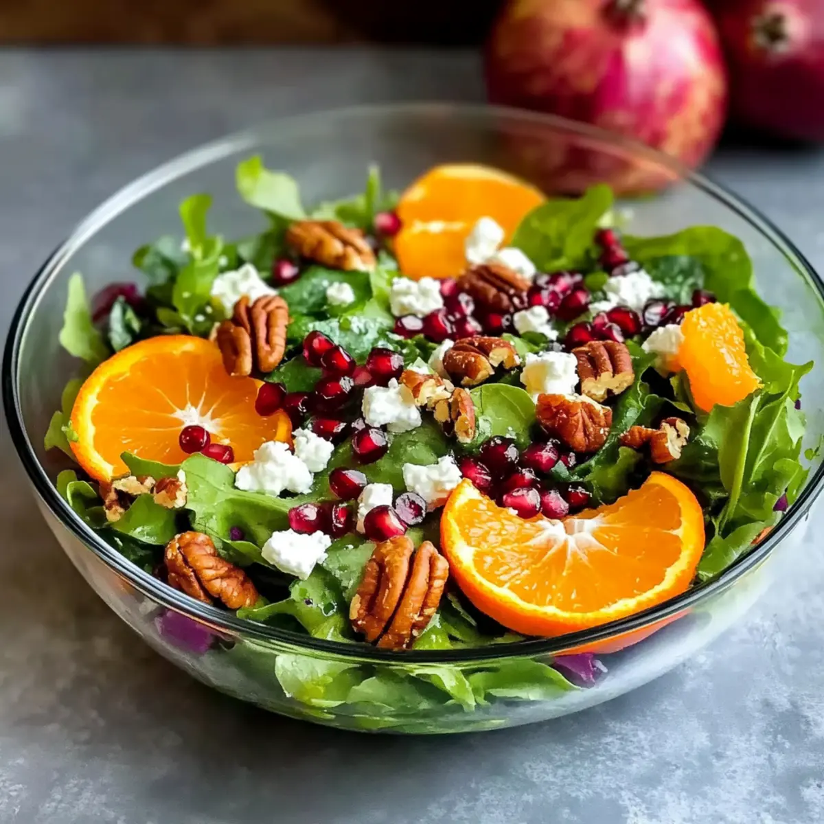 Vibrant Colors: This Winter Salad is a feast for the eyes, featuring bright oranges and ruby pomegranate seeds that make it a showstopper on any holiday table.